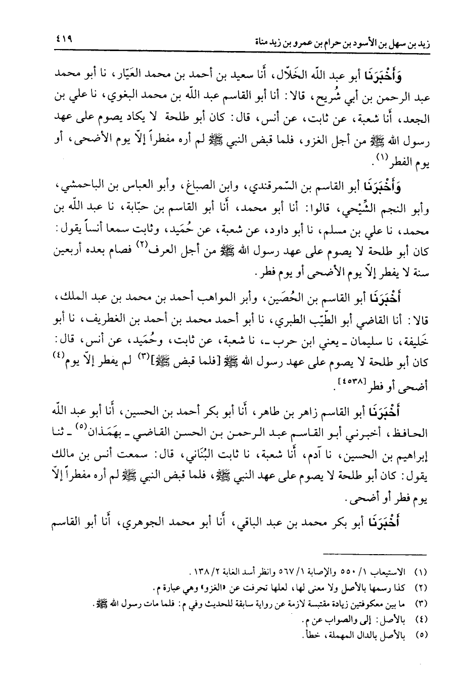 وأخبرنا أبو عبد الله الخلال أنا سعيد بن أحمد بن محمد العيار نا أبو محمد عبد الرحمن بن أبي شريح قالا أنا أبو القاسم عبد الله بن محمد البغوي نا علي بن الجعد أنا شعبة عن ثابت عن أنس قال كان أبو طلحة لا يكاد يصوم على عهد رسول الله ص - من أجل الغزو فلما قبض النبي ص - لم أره مفطرا إلا يوم الأضحى أو يوم الفطر (1) وأخبرنا أبو القاسم بن السمرقندي وابن الصباغ وأبو العباس بن الباحمشي وأبو النجم الشيحي قالوا أنا أبو محمد أنا أبو القاسم بن حبابة نا عبد الله بن محمد نا علي بن مسلم نا أبو داود عن شعبة عن حميد وثابت سمعا أنسا يقول كان أبو طلحة لا يصوم على عهد رسول الله ص - من أجل العرف (2) فصام بعده أربعين سنة لا يفطر إلا يوم الأضحى أو يوم الفطر أخبرنا أبو القاسم بن الحصين وأبو المواهب أحمد بن محمد بن عبد الملك قالا أنا القاضي أبو الطيب الطبري نا أبو أحمد محمد بن أحمد بن الغطريف نا أبو خليفة نا سليمان يعني ابن حرب نا شعبة عن ثابت وحميد وعن أنس قال كان أبو طلحة لا يصوم على عهد رسول الله ص - فلما قبض ص (3) - لم يفطر إلا يوم (4) أضحى أو فطر