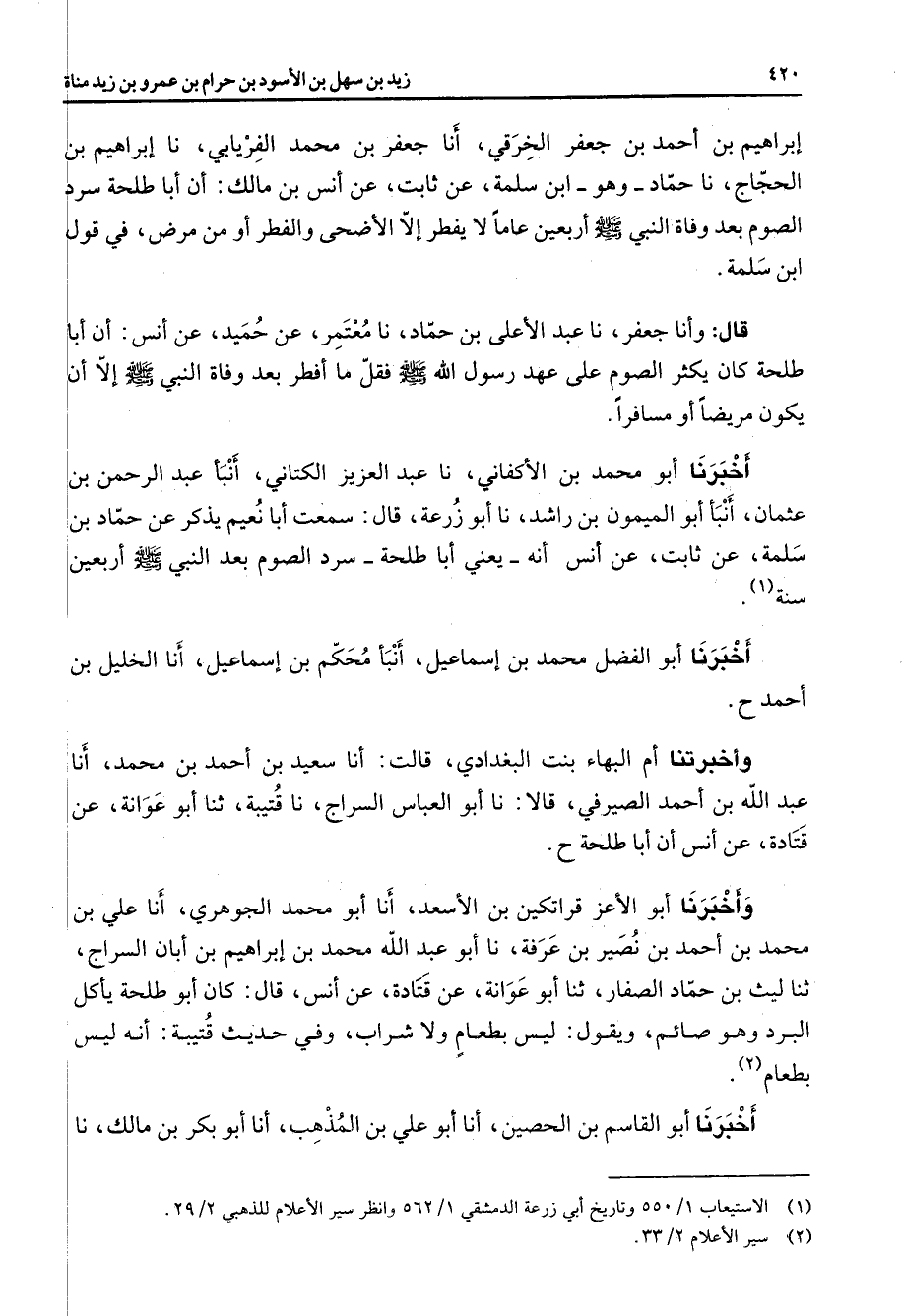 إبراهيم بن أحمد بن جعفر الخرقي أنا جعفر بن محمد الفريابي نا إبراهيم بن الحجاج نا حماد وهو ابن سلمة عن ثابت عن أنس بن مالك أن أبا طلحة سرد الصوم بعد وفاة النبي ص - أربعين عاما لا يفطر إلا الأضحى والفطر أو من مرض في قول ابن سلمة قال وأنا جعفر نا عبد الأعلى بن حماد نا معتمر عن حميد عن أنس أن أبا طلحة كان يكثر الصوم على عهد رسول الله ص - فقل ما أفطر بعد وفاة النبي ص - إلا أن يكون مريضا أو مسافرا أخبرنا أبو محمد بن الأكفاني نا عبد العزيز الكتاني أنبأ عبد الرحمن بن عثمان أنبأ أبو الميمون بن راشد نا أبو زرعة قال سمعت أبا نعيم يذكر عن حماد بن سلمة عن ثابت عن أنس أنه يعني أبا طلحة سرد الصوم بعد النبي ص - أربعين سنة (1) أخبرنا أبو الفضل محمد بن إسماعيل أنبأ محكم بن إسماعيل أنا الخليل بن أحمد وأخبرتنا أم البهاء بنت البغدادي قالت أنا سعيد بن أحمد بن محمد أنا عبد الله بن أحمد الصيرفي قالا نا أبو العباس السراج نا قتيبة ثنا أبو عوانة عن قتادة عن أنس أن أبا طلحة وأخبرنا أبو الأعز قراتكين بن الأسعد أنا أبو محمد الجوهري أنا علي بن محمد بن أحمد بن نصير بن عرفة نا أبو عبد الله محمد بن إبراهيم بن أبان السراج ثنا ليث بن حماد الصفار ثنا أبو عوانة عن قتادة عن أنس قال كان أبو طلحة يأكل البرد وهو صائم ويقول ليس بطعام ولا شراب وفي حديث قتيبة أنه ليس بطعام (2) أخبرنا أبو القاسم بن الحصين أنا أبو علي بن المذهب أنا أبو بكر بن مالك نا