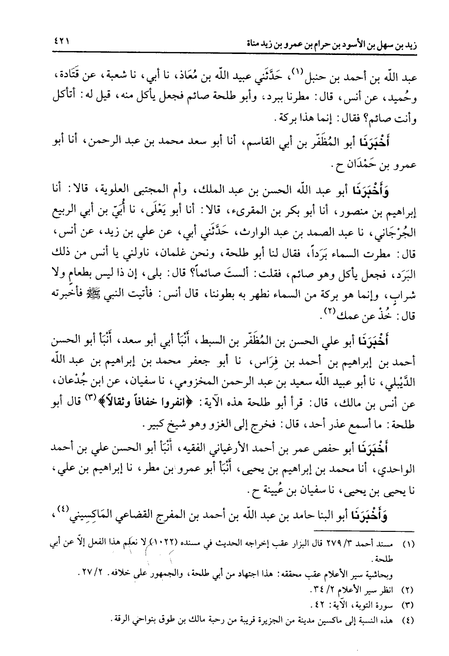 عبد الله بن أحمد بن حنبل (1) حدثني عبيد الله بن معاذ نا أبي نا شعبة عن قتادة وحميد عن أنس قال مطرنا ببرد وأبو طلحة صائم فجعل يأكل منه قيل له أتأكل وأنت صائم فقال إنما هذا بركة أخبرنا أبو المظفر بن أبي القاسم أنا أبو سعد محمد بن عبد الرحمن أنا أبو عمرو بن حمدان وأخبرنا أبو عبد الله الحسن بن عبد الملك وأم المجتبى العلوية قالا أنا إبراهيم بن منصور أنا أبو بكر بن المقرئ قالا أنا أبو يعلى نا أبي بن أبي الربيع الجرجاني نا عبد الصمد بن عبد الوارث حدثني أبي عن علي بن زيد عن أنس قال مطرت السماء بردا فقال لنا أبو طلحة ونحن غلمان ناولني يا أنس من ذلك البرد فجعل يأكل وهو صائم فقلت ألست صائما قال بلى إن ذا ليس بطعام ولا شراب وإنما هو بركة من السماء نطهر به بطوننا قال أنس فأتيت النبي ص - فأخبرته قال خذ عن عمك (2) أخبرنا أبو علي الحسن بن المظفر بن السبط أنبأ أبي أبو سعد أنبأ أبو الحسن أحمد بن إبراهيم بن أحمد بن فراس نا أبو جعفر محمد بن إبراهيم بن عبد الله الديبلي نا أبو عبيد الله سعيد بن عبد الرحمن المخزومي نا سفيان عن ابن جدعان عن أنس بن مالك قال قرأ أبو طلحة هذه الآية " انفروا خفافا وثقالا " (3) قال أبو طلحة ما أسمع عذر أحد قال فخرج إلى الغزو وهو شيخ كبير أخبرنا أبو حفص عمر بن أحمد الأرغياني الفقيه أنبأ أبو الحسن علي بن أحمد الواحدي أنا محمد بن إبراهيم بن يحيى أنبأ أبو عمرو بن مطر نا إبراهيم بن علي نا يحيى بن يحيى نا سفيان بن عيينة وأخبرنا أبو البنا حامد بن عبد الله بن أحمد بن المفرج القضاعي الماكسيني (4)