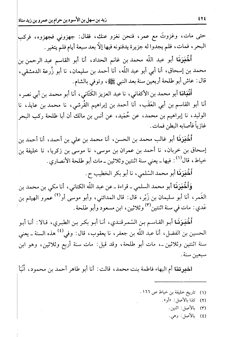 حتى مات وغزوت مع عمر فنحن نغزو عنك فقال جهزوني فجهزوه فركب البحر فمات فلم يجدوا له جزيرة يدفنونه فيها إلا بعد سبعة أيام فلم يتغير أخبرنا أبو عبد الله محمد بن غانم الحداد أنا أبو القاسم عبد الرحمن بن محمد بن إسحاق أنا أبي أبو عبد الله أنا أحمد بن سليمان نا أبو زرعة الدمشقي قال عاش أبو طلحة أربعين سنة بعد النبي ص - وتوفي بالشام أنبأنا أبو محمد بن الأكفاني نا عبد العزيز الكتاني أنا أبو محمد بن أبي نصر أنا أبو القاسم بن أبي العقب أنا أحمد بن إبراهيم القرشي نا محمد بن عايذ نا الوليد نا إبراهيم بن محمد عن حميد عن أنس بن مالك أن أبا طلحة ركب البحر غازيا فأصابه البطن فمات أخبرنا أبو غالب محمد بن الحسن أنا محمد بن علي بن أحمد أنا أحمد بن إسحاق بن خربان نا أحمد بن عمران بن موسى نا موسى بن زكريا نا خليفة بن خياط قال (1) فيها يعني سنة اثنتين وثلاثين مات أبو طلحة الأنصاري أخبرنا أبو محمد السلمي نا أبو بكر الخطيب وأخبرنا أبو محمد السلمي قراءة عن عبد الله الكتاني أنا مكي بن محمد بن الغمر أنا أبو سليمان بن زبر قال قال المدائني وأبو موسى أو (2) عمرو الهيثم بن عدي مات في سنة اثنتين (3) وثلاثين ابن مسعود وأبو طلحة أخبرنا أبو القاسم بن السمرقندي أنا أبو بكر بن الطبري قالا أنا أبو الحسين بن الفضل أنا عبد الله بن جعفر نا يعقوب قال وفي (4) هذه السنة يعني سنة اثنتين وثلاثين مات أبو طلحة وقد قيل مات سنة أربع وثلاثين وهو ابن سبعين سنة أخبرتنا أم البهاء فاطمة بنت محمد قالت أنا أبو طاهر أحمد بن محمود أنبأ