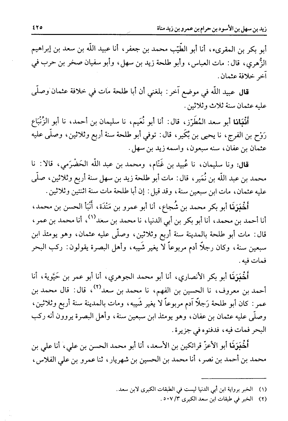 أبو بكر بن المقرئ أنا أبو الطيب محمد بن جعفر أنا عبيد الله بن سعد بن إبراهيم الزهري قال مات العباس وأبو طلحة زيد بن سهل وأبو سفيان صخر بن حرب في آخر خلافة عثمان قال عبيد الله في موضع آخر بلغني أن أبا طلحة مات في خلافة عثمان وصلى عليه عثمان سنة ثلاث وثلاثين أنبأنا أبو سعد المطرز قال أنا أبو نعيم نا سليمان بن أحمد نا أبو الزنباع روح بن الفرج نا يحيى بن بكير قال توفي أبو طلحة سنة أربع وثلاثين وصلى عليه عثمان بن عفان سنة سبعون واسمه زيد بن سهل قال ونا سليمان نا عبيد بن غنام ومحمد بن عبد الله الحضرمي قالا نا محمد بن عبد الله بن نمير قال مات أبو طلحة زيد بن سهل سنة أربع وثلاثين صلى عليه عثمان مات ابن سبعين سنة وقد قيل إن أبا طلحة مات سنة اثنتين وثلاثين أخبرنا أبو بكر محمد بن شجاع أنا أبو عمرو بن مندة أنبأ الحسن بن محمد أنا أحمد بن محمد أنا أبو بكر بن أبي الدنيا نا محمد بن سعد (1) أنا محمد بن عمر قال مات أبو طلحة بالمدينة سنة أربع وثلاثين وصلى عليه عثمان وهو يومئذ ابن سبعين سنة وكان رجلا أدم مربوعا لا يغير شيبه وأهل البصرة يقولون ركب البحر فمات فيه أخبرنا أبو بكر الأنصاري أنا أبو محمد الجوهري أنا أبو عمر بن حيوية أنا أحمد بن معروف نا الحسين بن الفهم نا محمد بن سعد (2) قال قال محمد بن عمر كان أبو طلحة رجلا آدم مربوعا لا يغير شيبه ومات بالمدينة سنة أربع وثلاثين وصلى عليه عثمان بن عفان وهو يومئذ ابن سبعين سنة وأهل البصرة يروون أنه ركب البحر فمات فيه فدفنوه في جزيرة أخبرنا أبو الأعز قراتكين بن الأسعد أنا أبو محمد الحسن بن علي أنا علي بن محمد بن أحمد بن نصر أنا محمد بن الحسين بن شهريار ثنا عمرو بن علي الفلاس