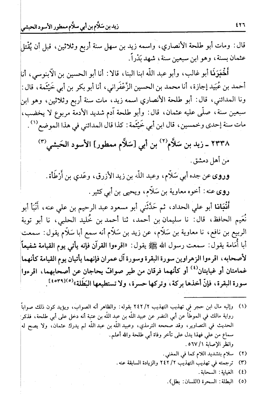 2338 - زيد بن سلام (2) بن أبي سلام ممطور الأسود الحبشي (3) من أهل دمشق وروى عن جده أبي سلام وعبد الله بن زيد الأزرق وعدي بن أرطأة روى عنه أخوه معاوية بن سلام ويحيى بن أبي كثير أنبأنا أبو علي الحداد ثم حدثني أبو مسعود عبد الرحيم بن علي عنه أنبأ أبو نعيم الحافظ قال نا سليمان بن أحمد ثنا أحمد بن خليد الحلبي نا أبو توبة الربيع بن نافع نا معاوية بن سلام عن زيد بن سلام أنه سمع أبا سلام يقول سمعت أبا أمامة يقول سمعت رسول الله ص - يقول اقرءوا القرآن فإنه يأتي يوم القيامة شفيعا لأصحابه اقرءوا الزهراوين سورة البقرة وسورة آل عمران فإنهما يأتيان يوم القيامة كأنهما غمامتان أو غيايتان (4) أو كأنهما فرقان من طير صواف يحاجان عن أصحابهما اقرءوا سورة البقرة فإن أخذها بركة وتركها حسرة ولا تستطيعها البطلة (5)