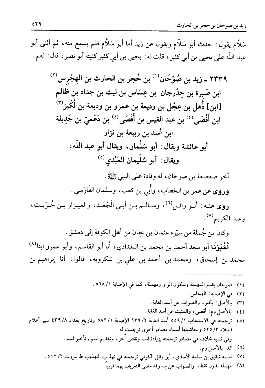 2339 - زيد بن صوحان (1) بن حجر بن الحارث بن الهجرس (2) ابن صبرة بن حدرجان بن عساس بن ليث بن جداد بن ظالم ابن ذهل بن عجل بن وديعة بن عمرو بن وديعة بن لكيز (3) ابن أفصى (4) بن عبد القيس بن أفصى (4) بن دعمي بن جديلة ابن أسد بن ربيعة بن نزار أبو عائشة ويقال أبو سلمان ويقال أبو عبد الله ويقال أبو سليمان العبدي أخو صعصعة بن صوحان له وفادة على النبي ص - وروى عن عمر بن الخطاب وأبي بن كعب وسلمان الفارسي روى عنه أبو وائل (6) وسالم بن أبي الجعد والعيزار بن حريث وعبد الكريم (7) وكان من جملة من سيره عثمان بن عفان من أهل الكوفة إلى دمشق أخبرنا أبو سعد أحمد بن محمد بن البغدادي أنا أبو القاسم وأبو عمرو ابنا (8) محمد بن إسحاق ومحمد بن أحمد بن علي بن شكرويه قالوا أنا إبراهيم بن