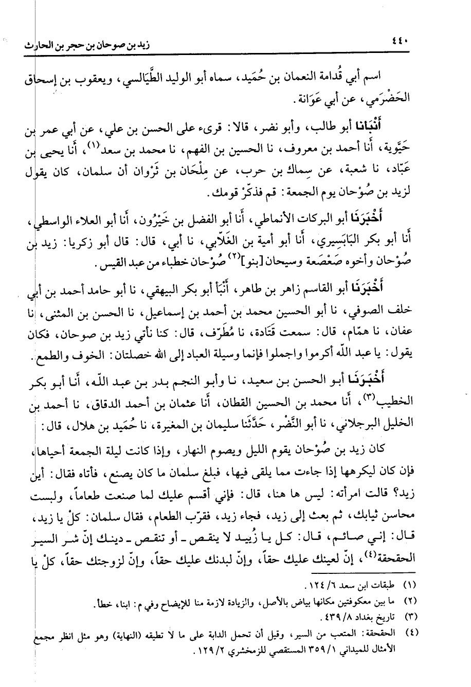 اسم أبي قدامة النعمان بن حميد سماه أبو الوليد الطيالسي ويعقوب بن إسحاق الحضرمي عن أبي عوانة أنبأنا أبو طالب وأبو نضر قالا قرئ على الحسن بن علي عن أبي عمر بن حيوية أنا أحمد بن معروف نا الحسين بن الفهم نا محمد بن سعد (1) أنا يحيى بن عباد نا شعبة عن سماك بن حرب عن ملحان بن ثروان أن سلمان كان يقول لزيد بن صوحان يوم الجمعة قم فذكر قومك أخبرنا أبو البركات الأنماطي أنا أبو الفضل بن خيرون أنا أبو العلاء الواسطي أنا أبو بكر البابسيري أنا أبو أمية بن الغلابي نا أبي قال قال أبو زكريا زيد بن صوحان وأخوه صعصعة وسيحان بنو (2) صوحان خطباء من عبد القيس أخبرنا أبو القاسم زاهر بن طاهر أنبأ أبو بكر البيهقي نا أبو حامد أحمد بن أبي خلف الصوفي نا أبو الحسين محمد بن أحمد بن إسماعيل نا الحسن بن المثنى نا عفان نا همام قال سمعت قتادة نا مطرف قال كنا نأتي زيد بن صوحان فكان يقول يا عبد الله أكرموا واجملوا فإنما وسيلة العباد إلى الله خصلتان الخوف والطمع أخبرنا أبو الحسن بن سعيد نا وأبو النجم بدر بن عبد الله أنا أبو بكر الخطيب (3) أنا محمد بن الحسين القطان أنا عثمان بن أحمد الدقاق نا أحمد بن الخليل البرجلاني نا أبو النضر حدثنا سليمان بن المغيرة نا حميد بن هلال قال كان زيد بن صوحان يقوم الليل ويصوم النهار وإذا كانت ليلة الجمعة أحياها فإن كان ليكرهها إذا جاءت مما يلقى فيها فبلغ سلمان ما كان يصنع فأتاه فقال أين زيد قالت امرأته ليس ها هنا قال فإني أقسم عليك لما صنعت طعاما ولبست محاسن ثيابك ثم بعث إلى زيد فجاء زيد فقرب الطعام فقال سلمان كل يا زيد قال إني صائم قال كل يا زييد لا ينقص أو تنقص دينك إن شر السير الحقحقة (4) إن لعينك عليك حقا وإن لبدنك عليك حقا وإن لزوجتك حقا كل يا