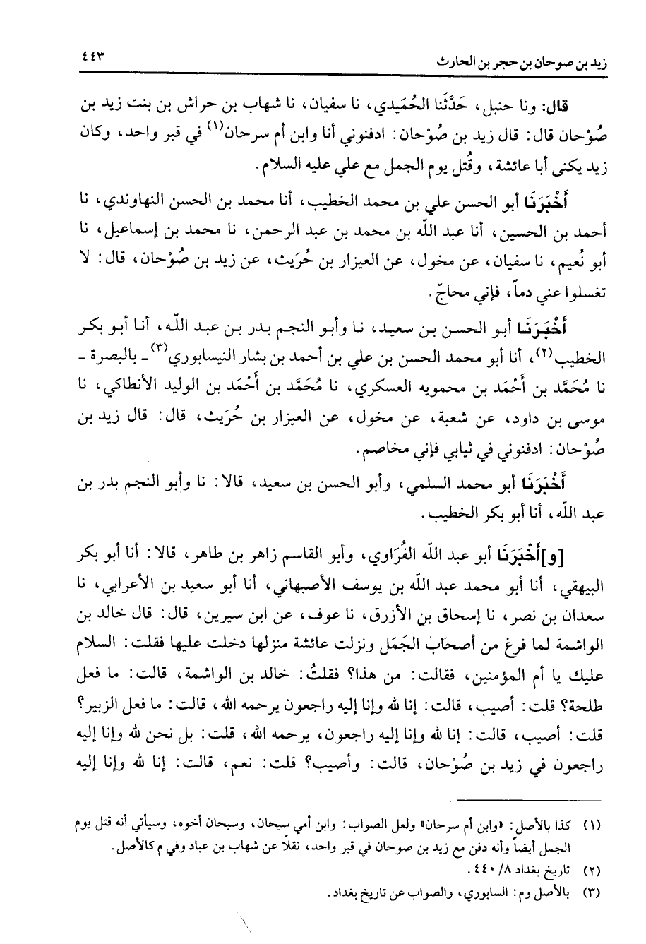 قال ونا حنبل حدثنا الحميدي نا سفيان نا شهاب بن حراش بن بنت زيد بن صوحان قال قال زيد بن صوحان ادفنوني أنا وابن أم سرحان (1) في قبر واحد وكان زيد يكنى أبا عائشة وقتل يوم الجمل مع علي عليه السلام أخبرنا أبو الحسن علي بن محمد الخطيب أنا محمد بن الحسن النهاوندي نا أحمد بن الحسين أنا عبد الله بن محمد بن عبد الرحمن نا محمد بن إسماعيل نا أبو نعيم نا سفيان عن مخول عن العيزار بن حريث عن زيد بن صوحان قال لا تغسلوا عني دما فإني محاج أخبرنا أبو الحسن بن سعيد نا وأبو النجم بدر بن عبد الله أنا أبو بكر الخطيب (2) أنا أبو محمد الحسن بن علي بن أحمد بن بشار النيسابوري (3) بالبصرة نا محمد بن أحمد بن محمويه العسكري نا محمد بن أحمد بن الوليد الأنطاكي نا موسى بن داود عن شعبة عن مخول عن العيزار بن حريث قال قال زيد بن صوحان ادفنوني في ثيابي فإني مخاصم أخبرنا أبو محمد السلمي وأبو الحسن بن سعيد قالا نا وأبو النجم بدر بن عبد الله أنا أبو بكر الخطيب وأخبرنا أبو عبد الله الفراوي وأبو القاسم زاهر بن طاهر قالا أنا أبو بكر البيهقي أنا أبو محمد عبد الله بن يوسف الأصبهاني أنا أبو سعيد بن الأعرابي نا سعدان بن نصر نا إسحاق بن الأزرق نا عوف عن ابن سيرين قال قال خالد بن الواشمة لما فرغ من أصحاب الجمل ونزلت عائشة منزلها دخلت عليها فقلت السلام عليك يا أم المؤمنين فقالت من هذا فقلت خالد بن الواشمة قالت ما فعل طلحة قلت أصيب قالت إنا لله وإنا إليه راجعون يرحمه الله قالت ما فعل الزبير قلت أصيب قالت إنا لله وإنا إليه راجعون يرحمه الله قلت بل نحن لله وإنا إليه راجعون في زيد بن صوحان قالت وأصيب قلت نعم قالت إنا لله وإنا إليه