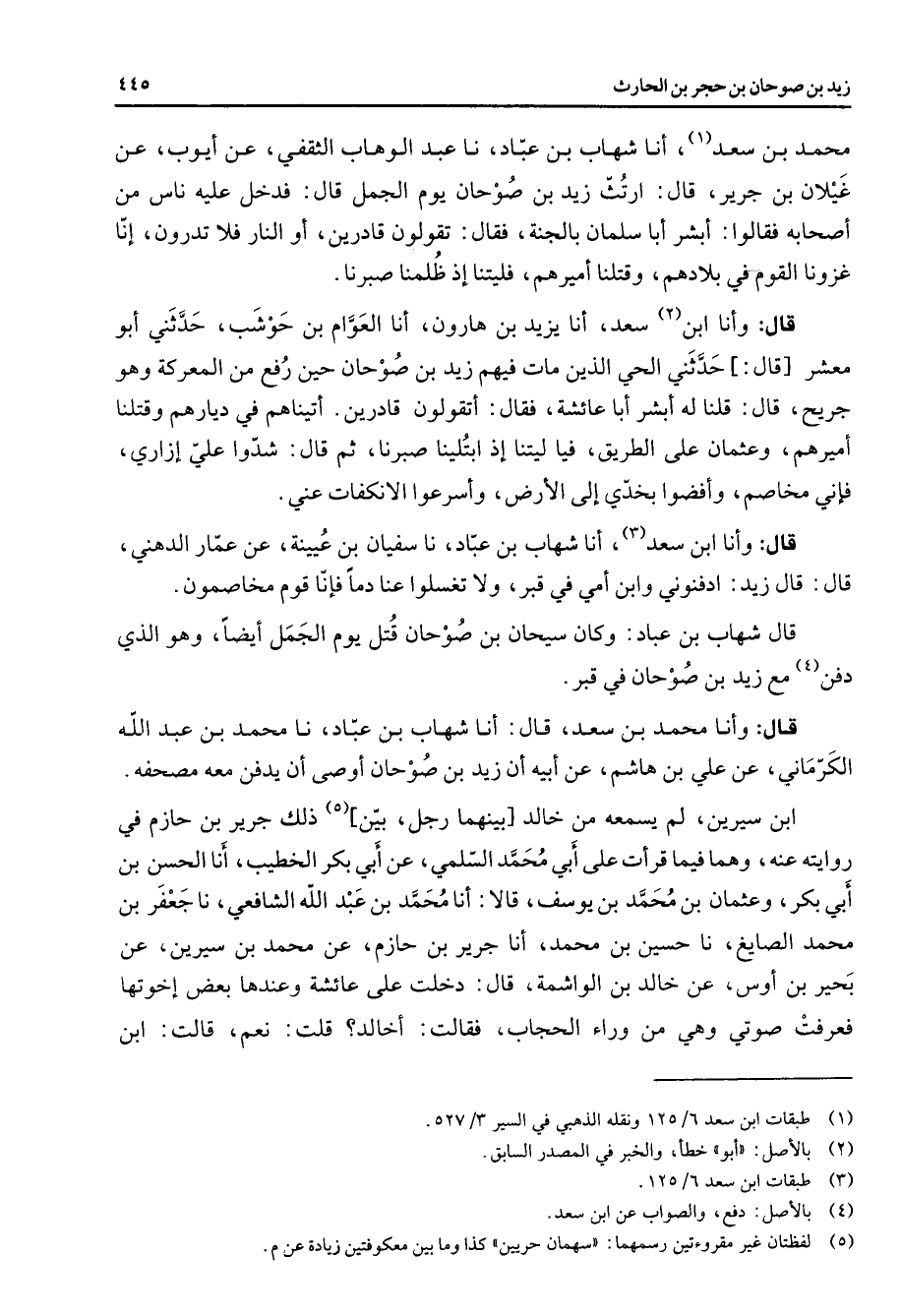 محمد بن سعد (1) أنا شهاب بن عباد نا عبد الوهاب الثقفي عن أيوب عن غيلان بن جرير قال ارتث زيد بن صوحان يوم الجمل قال فدخل عليه ناس من أصحابه فقالوا أبشر أبا سلمان بالجنة فقال تقولون قادرين أو النار فلا تدرون إنا غزونا القوم في بلادهم وقتلنا أميرهم فليتنا إذ ظلمنا صبرنا قال وأنا ابن (2) سعد أنا يزيد بن هارون أنا العوام بن حوشب حدثني أبو معشر قال حدثني الحي الذين مات فيهم زيد بن صوحان حين رفع من المعركة وهو جريح قال قلنا له أبشر أبا عائشة فقال أتقولون قادرين أتيناهم في ديارهم وقتلنا أميرهم وعثمان على الطريق فيا ليتنا إذ ابتلينا صبرنا ثم قال شدوا علي إزاري فإني مخاصم وأفضوا بخدي إلى الأرض وأسرعوا الانكفات عني قال وأنا ابن سعد (3) أنا شهاب بن عباد نا سفيان بن عيينة عن عمار الدهني قال قال زيد ادفنوني وابن أمي في قبر ولا تغسلوا عنا دما فإنا قوم مخاصمون قال شهاب بن عباد وكان سيحان بن صوحان قتل يوم الجمل أيضا وهو الذي دفن (4) مع زيد بن صوحان في قبر قال وأنا محمد بن سعد قال أنا شهاب بن عباد نا محمد بن عبد الله الكرماني عن علي بن هاشم عن أبيه أن زيد بن صوحان أوصى أن يدفن معه مصحفه ابن سيرين لم يسمعه من خالد بينهما رجل بين (5) ذلك جرير بن حازم في روايته عنه وهما فيما قرأت على أبي محمد السلمي عن أبي بكر الخطيب أنا الحسن بن أبي بكر وعثمان بن محمد بن يوسف قالا أنا محمد بن عبد الله الشافعي نا جعفر بن محمد الصايغ نا حسين بن محمد أنا جرير بن حازم عن محمد بن سيرين عن بحير بن أوس عن خالد بن الواشمة قال دخلت على عائشة وعندها بعض إخوتها فعرفت صوتي وهي من وراء الحجاب فقالت أخالد قلت نعم قالت ابن