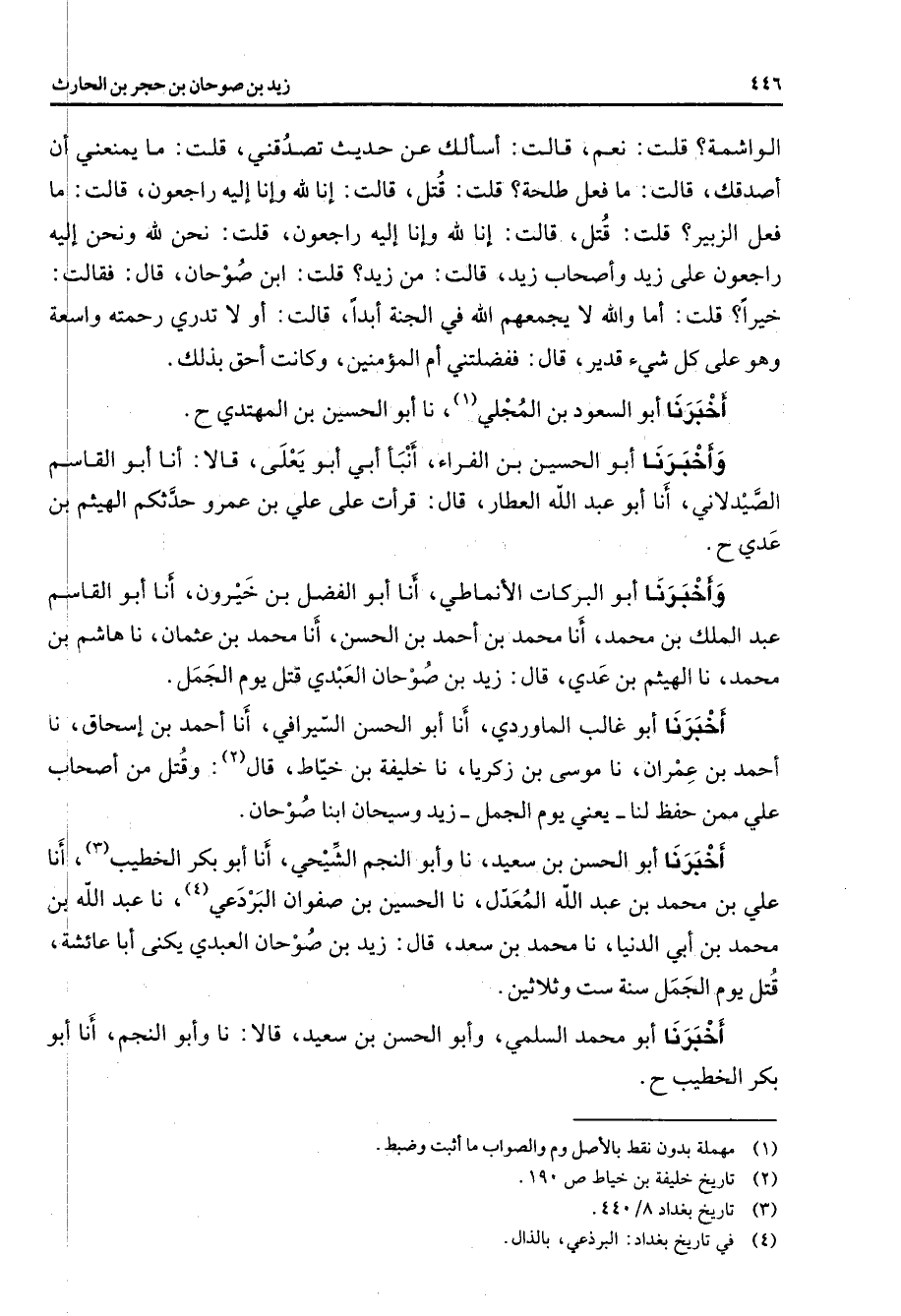 الواشمة قلت نعم قالت أسألك عن حديث تصدقني قلت ما يمنعني أن أصدقك قالت ما فعل طلحة قلت قتل قالت إنا لله وإنا إليه راجعون قالت ما فعل الزبير قلت قتل قالت إنا لله وإنا إليه راجعون قلت نحن لله ونحن إليه راجعون على زيد وأصحاب زيد قالت من زيد قلت ابن صوحان قال فقالت خيرا قلت أما والله لا يجمعهم الله في الجنة أبدا قالت أو لا تدري رحمته واسعة وهو على كل شئ قدير قال ففضلتني أم المؤمنين وكانت أحق بذلك أخبرنا أبو السعود بن المجلي (1) نا أبو الحسين بن المهتدي وأخبرنا أبو الحسين بن الفراء أنبأ أبي أبو يعلى قالا أنا أبو القاسم الصيدلاني أنا أبو عبد الله العطار قال قرأت على علي بن عمرو حدثكم الهيثم بن عدي وأخبرنا أبو البركات الأنماطي أنا أبو الفضل بن خيرون أنا أبو القاسم عبد الملك بن محمد أنا محمد بن أحمد بن الحسن أنا محمد بن عثمان نا هاشم بن محمد نا الهيثم بن عدي قال زيد بن صوحان العبدي قتل يوم الجمل أخبرنا أبو غالب الماوردي أنا أبو الحسن السيرافي أنا أحمد بن إسحاق نا أحمد بن عمران نا موسى بن زكريا نا خليفة بن خياط قال (2) وقتل من أصحاب علي ممن حفظ لنا يعني يوم الجمل زيد وسيحان ابنا صوحان أخبرنا أبو الحسن بن سعيد نا وأبو النجم الشيحي أنا أبو بكر الخطيب (3) أنا علي بن محمد بن عبد الله المعدل نا الحسين بن صفوان البردعي (4) نا عبد الله بن محمد بن أبي الدنيا نا محمد بن سعد قال زيد بن صوحان العبدي يكنى أبا عائشة قتل يوم الجمل سنة ست وثلاثين أخبرنا أبو محمد السلمي وأبو الحسن بن سعيد قالا نا وأبو النجم أنا أبو بكر الخطيب