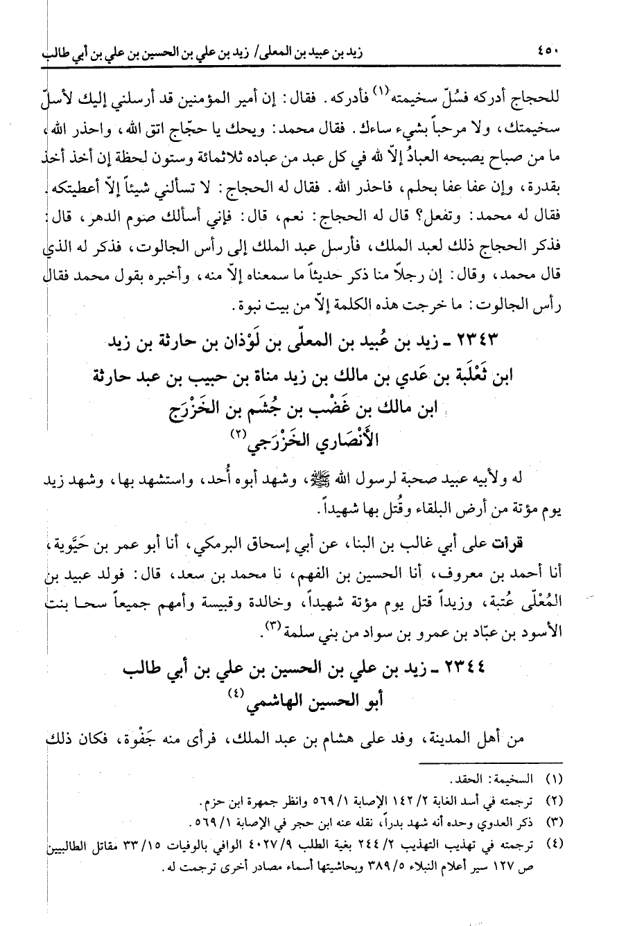 2344 - زيد بن علي بن الحسين بن علي بن أبي طالب أبو الحسين الهاشمي (4) من أهل المدينة وفد على هشام بن عبد الملك فرأى منه جفوة فكان ذلك