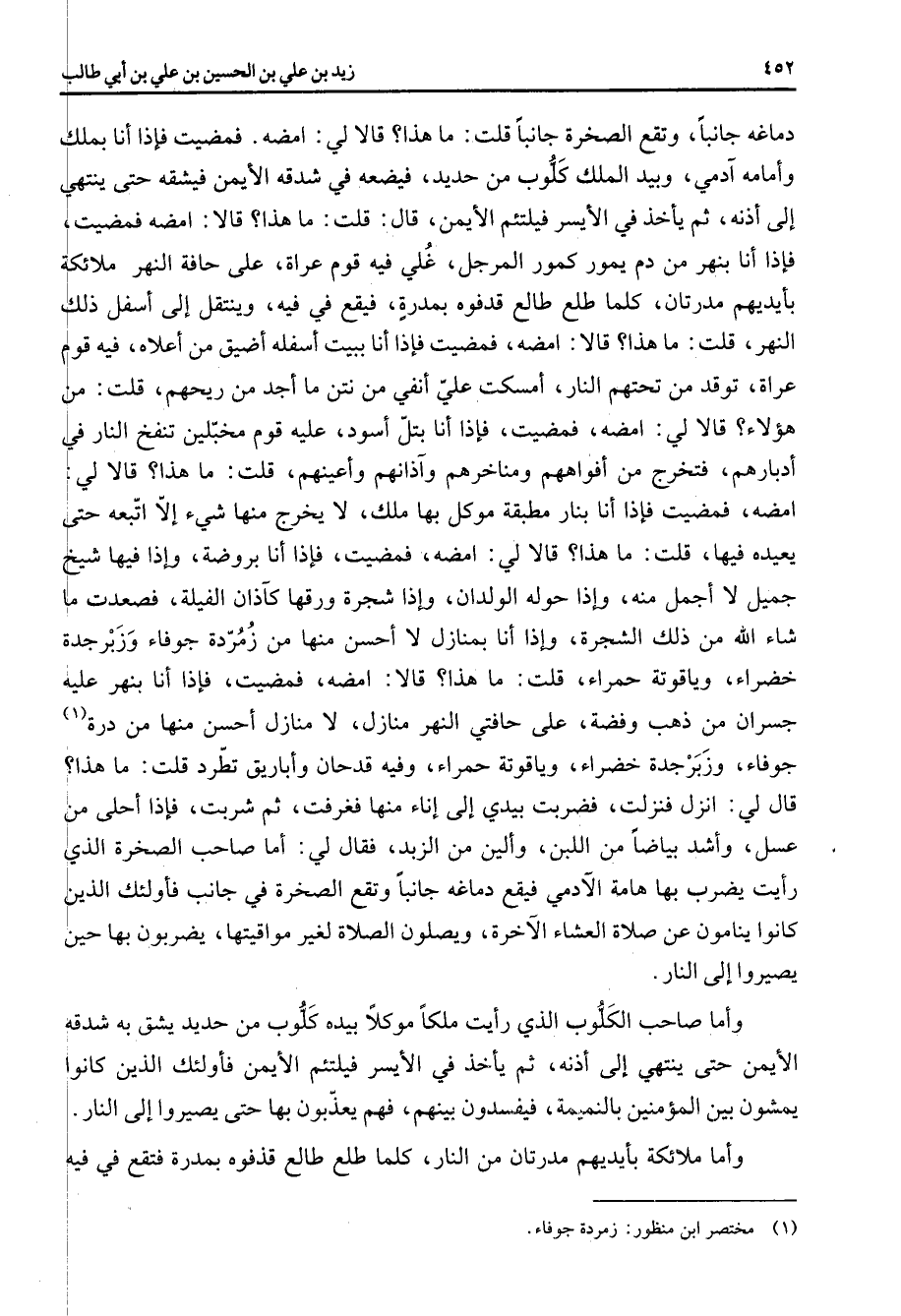 دماغه جانبا وتقع الصخرة جانبا قلت ما هذا قالا لي امضه فمضيت فإذا أنا بملك وأمامه آدمي وبيد الملك كلوب من حديد فيضعه في شدقه الأيمن فيشقه حتى ينتهي إلى أذنه ثم يأخذ في الأيسر فيلتئم الأيمن قال قلت ما هذا قالا امضه فمضيت فإذا أنا بنهر من دم يموكمور المرجل غلي فيه قوم عراة على حافة النهر ملائكة بأيديهم مدرتان كلما طلع طالع قذفوه بمدرة فيقع في فيه وينتقل إلى أسفل ذلك النهر قلت ما هذا قالا امضه فمضيت فإذا أنا ببيت أسفله أضيق من أعلاه فيه قوم عراة توقد من تحتهم النار أمسكت علي أنفي من نتن ما أجد من ريحهم قلت من هؤلاء قالا لي امضه فمضيت فإذا أنا بتل أسود عليه قوم مخبلين تنفخ النار في أدبارهم فتخرج من أفواههم ومناخرهم وآذانهم وأعينهم قلت ما هذا قالا لي امضه فمضيت فإذا أنا بنار مطبقة موكل بها ملك لا يخرج منها شئ إلا اتبعه حتى يعيده فيها قلت ما هذا قالا لي امضه فمضيت فإذا أنا بروضة وإذا فيها شيخ جميل لا أجمل منه وإذا حوله الولدان وإذا شجرة ورقها كآذان الفيلة فصعدت ما شاء الله من ذلك الشجرة وإذا أنا بمنازل لا أحسن منها من زمردة جوفاء وزبرجدة خضراء وياقوتة حمراء قلت ما هذا قالا امضه فمضيت فإذا أنا بنهر عليه جسران من ذهب وفضة على حافتي النهر منازل لا منازل أحسن منها من درة (1) جوفاء وزبرجدة خضراء وياقوتة حمراء وفيه قدحان وأباريق تطرد قلت ما هذا قال لي انزل فنزلت فضربت بيدي إلى إناء منها فغرفت ثم شربت فإذا أحلى من عسل وأشد بياضا من اللبن وألين من الزبد فقال لي أما صاحب الصخرة الذي رأيت يضرب بها هامة الآدمي فيقع دماغه جانبا وتقع الصخرة في جانب فأولئك الذين كانوا ينامون عن صلاة العشاء الآخرة ويصلون الصلاة لغير مواقيتها يضربون بها حين يصيروا إلى النار وأما صاحب الكلوب الذي رأيت ملكا بيده كلوب من حديد يشق به شدقه الأيمن حتى ينتهي إلى أذنه ثم يأخذ في الأيسر فيلتئم الأيمن فأولئك الذين كانوا يمشون بين المؤمنين بالنميمة فيفسدون بينهم فهم يعذبون بها حتى يصيروا إلى النار وأما ملائكة بأيديهم مدرتان من النار كلما طلع قذفوه بمدرة فتقع في فيه