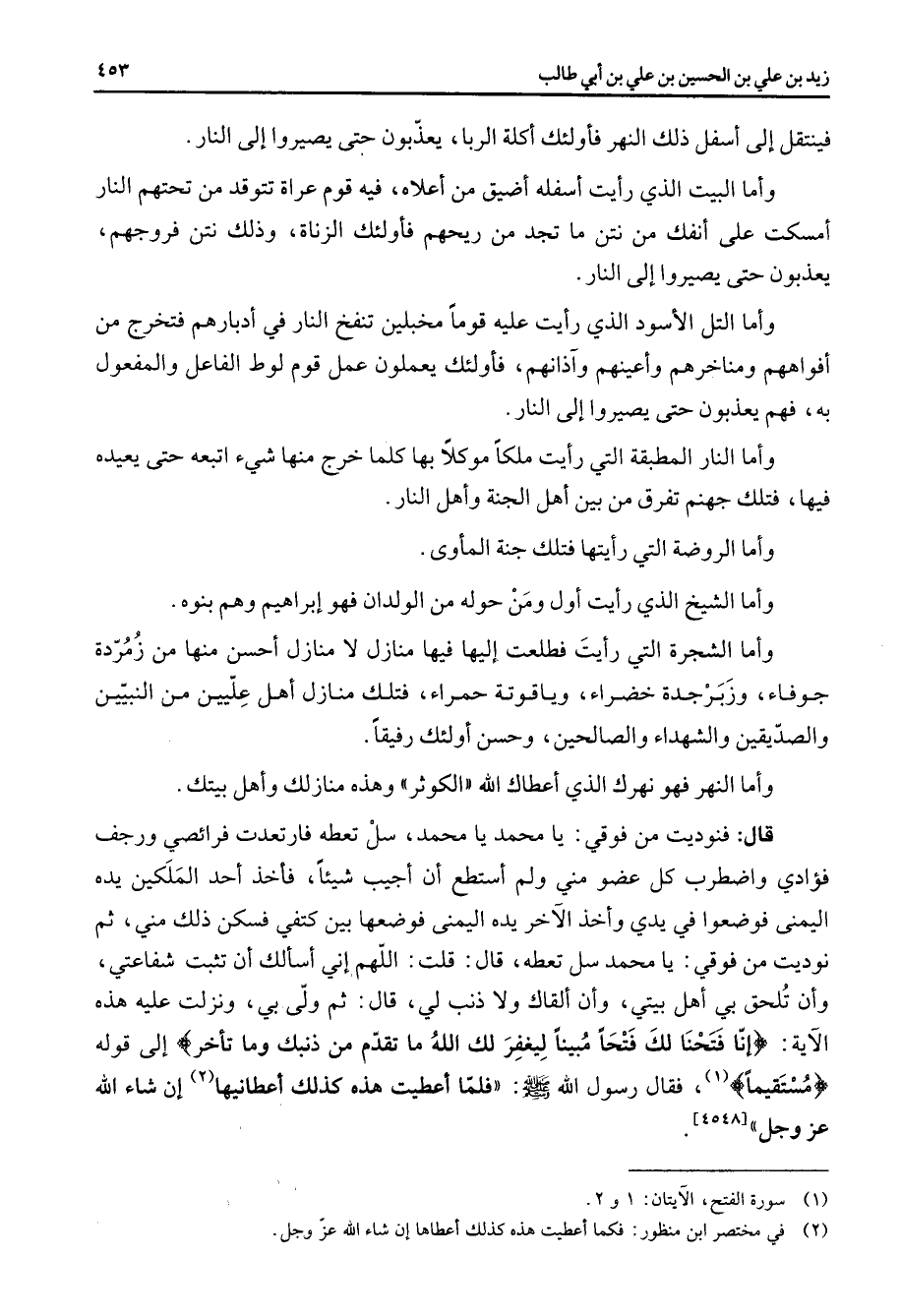 فينتقل إلى أسفل ذلك النهر فأولئك أكلة الربا يعذبون حتى يصيروا إلى النار وأما البيت الذي رأيت أسفله أضيق من أعلاه فيه قوم عراة تتوقد من تحتهم النار أمسكت على أنفك من نتن ما تجد من ريحهم فأولئك الزناة وذلك نتن فروجهم يعذبون حتى يصيروا إلى النار وأما التل الأسود الذي رأيت عليه قوما مخبلين تنفخ النار في أدبارهم فتخرج من أفواههم ومناخرهم وأعينهم وآذانهم فأولئك يعملون عمل قوم لوط الفاعل والمفعول به فهم يعذبون حتى يصيروا إلى النار وأما النار المطبقة التي رأيت ملكا موكلا بها كلما خرج منها شئ اتبعه حتى يعيده فيها فتلك جهنم تفرق من بين أهل الجنة وأهل النار وأما الروضة التي رأيتها فتلك جنة المأوى وأما الشيخ الذي رأيت أول ومن حوله من الولدان فهو إبراهيم وهم بنوه وأما الشجرة التي رأيت فطلعت إليها فيها منازل لا منازل أحسن منها من زمردة جوفاء وزبرجدة خضراء وياقوتة حمراء فتلك منازل أهل عليين من النبيين والصديقين والشهداء والصالحين وحسن أولئك رفيقا وأما النهر فهو نهرك الذي أعطاك الله الكوثر وهذه منازلك وأهل بيتك قال فنوديت من فوقي يا محمد يا محمد سل تعطه فارتعدت فرائصي ورجف فؤادي واضطرب كل عضو مني ولم أستطع أن أجيب شيئا فأخذ أحد الملكين يده اليمنى فوضعوا في يدي وأخذ الآخر يده اليمنى فوضعها بين كتفي فسكن ذلك مني ثم نوديت من فوقي يا محمد سل تعطه قال قلت اللهم إني أسألك أن تثبت شفاعتي وأن تلحق بي أهل بيتي وأن ألقاك ولا ذنب لي قال ثم ولى بي ونزلت عليه هذه الآية " إنا فتحنا لك فتحا مبينا ليغفر لك الله ما تقدم من ذنبك وما تأخر " إلى قوله " مستقيما " (1) فقال رسول الله ص - فلما أعطيت هذه كذلك أعطانيها (2) إن شاء الله عز وجل