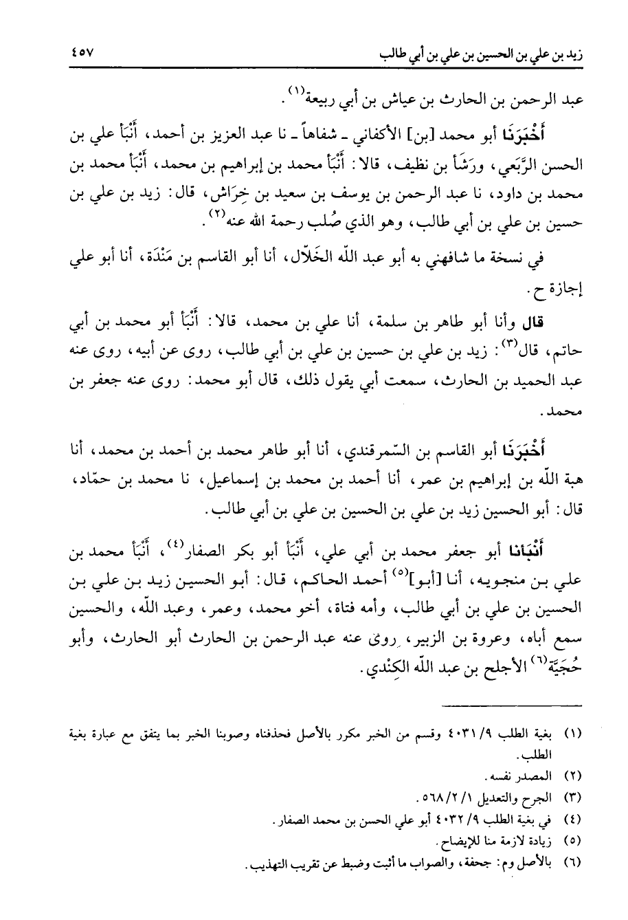 عبد الرحمن بن الحارث بن عياش بن أبي ربيعة (1) أخبرنا أبو محمد بن الأكفاني شفاها نا عبد العزيز بن أحمد أنبأ علي بن الحسن الربعي ورشأ بن نظيف قالا أنبأ محمد بن إبراهيم بن محمد أنبأ محمد بن محمد بن داود نا عبد الرحمن بن يوسف بن سعيد بن خراش قال زيد بن علي بن حسين بن علي بن أبي طالب وهو الذي صلب رحمة الله عنه (2) في نسخة ما شافهني به أبو عبد الله الخلال أنا أبو القاسم بن مندة أنا أبو علي إجازة قال وأنا أبو طاهر بن سلمة أنا علي بن محمد قالا أنبأ أبو محمد بن أبي حاتم قال (3) زيد بن علي بن حسين بن علي بن أبي طالب روى عن أبيه روى عنه عبد الحميد بن الحارث سمعت أبي يقول ذلك قال أبو محمد روى عنه جعفر بن محمد أخبرنا أبو القاسم بن السمرقندي أنا أبو طاهر محمد بن أحمد بن محمد أنا هبة الله بن إبراهيم بن عمر أنا أحمد بن محمد بن إسماعيل نا محمد بن حماد قال أبو الحسين زيد بن علي بن الحسين بن علي بن أبي طالب أنبأنا أبو جعفر محمد بن أبي علي أنبأ أبو بكر الصفار (4) أنبأ محمد بن علي بن منجويه أنا أبو (5) أحمد الحاكم قال أبو الحسين زيد بن علي بن الحسين بن علي بن أبي طالب وأمه فتاة أخو محمد وعمر وعبد الله والحسين سمع أباه وعروة بن الزبير روى عنه عبد الرحمن بن الحارث أبو الحارث وأبو حجية (6) الأجلح بن عبد الله الكندي