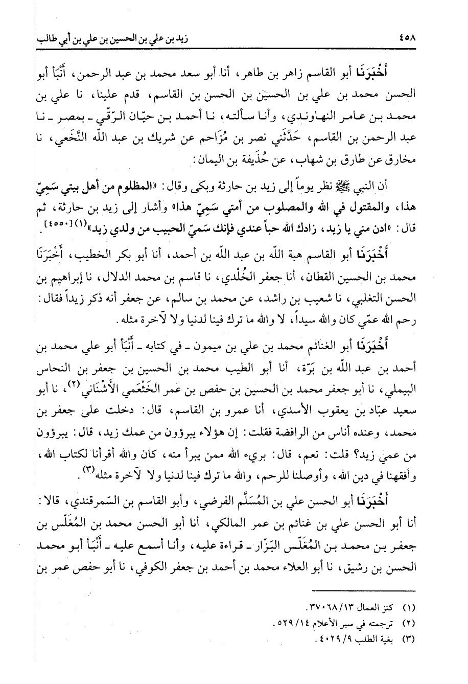 أخبرنا أبو القاسم زاهر بن طاهر أنا أبو سعد محمد بن عبد الرحمن أنبأ أبو الحسن محمد بن علي بن الحسين بن الحسن بن القاسم قدم علينا نا علي بن محمد بن عامر النهاوندي وأنا سألته نا أحمد بن حيان الرقي بمصر نا عبد الرحمن بن القاسم حدثني نصر بن مزاحم عن شريك بن عبد الله النخعي نا مخارق عن طارق بن شهاب عن حذيفة بن اليمان أن النبي ص - نظر يوما إلى زيد بن حارثة وبكى وقال المظلوم من أهل بيتي سمي هذا والمقتول في الله والمصلوب من أمتي سمي هذا وأشار إلى زيد بن حارثة ثم قال ادن مني يا زيد زادك الله حبا عندي فإنك سمي الحبيب من ولدي زيد (1)