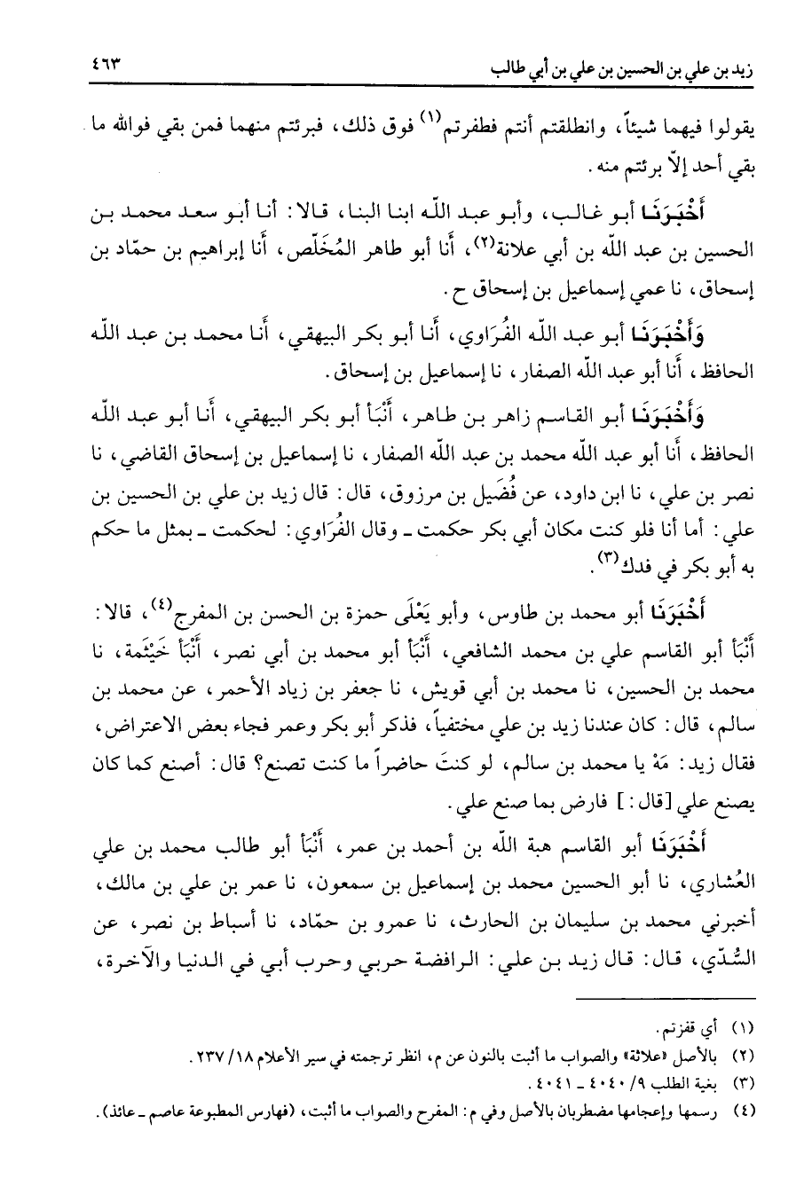 يقولوا فيهما شيئا وانطلقتم أنتم فطفرتم (1) فوق ذلك فبرئتم منهما فمن بقي فوالله ما بقي أحد إلا برئتم منه أخبرنا أبو غالب وأبو عبد الله ابنا البنا قالا أنا أبو سعد محمد بن الحسين بن عبد الله بن أبي علانة (2) أنا أبو طاهر المخلص أنا إبراهيم بن حماد بن إسحاق نا عمي إسماعيل بن إسحاق وأخبرنا أبو عبد الله الفراوي أنا أبو بكر البيهقي أنا محمد بن عبد الله الحافظ أنا أبو عبد الله الصفار نا إسماعيل بن إسحاق وأخبرنا أبو القاسم زاهر بن طاهر أنبأ أبو بكر البيهقي أنا أبو عبد الله الحافظ أنا أبو عبد الله محمد بن عبد الله الصفار نا إسماعيل بن إسحاق القاضي نا نصر بن علي نا ابن داود عن فضيل بن مرزوق قال قال زيد بن علي بن الحسين بن علي أما أنا فلو كنت مكان أبي بكر حكمت وقال الفراوي لحكمت بمثل ما حكم به أبو بكر في فدك (3) أخبرنا أبو محمد بن طاوس وأبو يعلى حمزة بن الحسن بن المفرج (4) قالا أنبأ أبو القاسم علي بن محمد الشافعي أنبأ أبو محمد بن أبي نصر أنبأ خيثمة نا