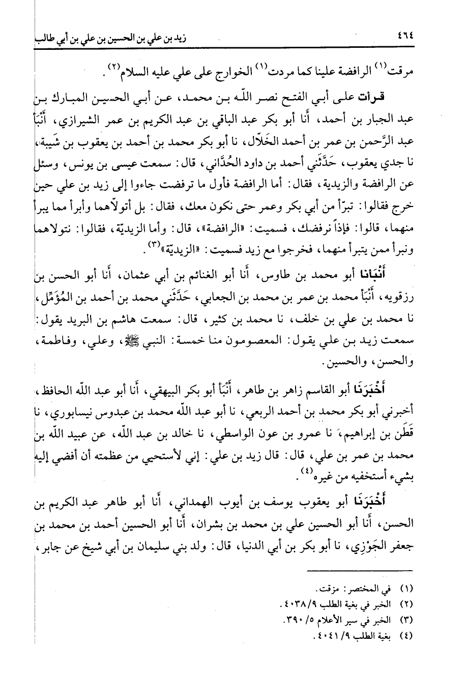 مرقت (1) الرافضة علينا كما مردت الخوارج على علي عليه السلام (2) قرأت على أبي الفتح نصر الله بن محمد عن أبي الحسين المبارك بن عبد الجبار بن أحمد أنا أبو بكر عبد الباقي بن عبد الكريم بن عمر الشيرازي أنبأ عبد الرحمن بن عمر بن أحمد الخلال نا أبو بكر محمد بن أحمد بن يعقوب بن شيبة نا جدي يعقوب حدثني أحمد بن داود الحداني قال سمعت عيسى بن يونس وسئل عن الرافضة والزيدية فقال أما الرافضة فأول ما ترفضت جاءوا إلى زيد بن علي حين خرج فقالوا تبرأ من أبي بكر وعمر حتى نكون معك فقال بل أتولاهما وأبرأ مما يبرأ منهما قالوا فإذا نرفضك فسميت الرافضة قال وأما الزيدية فقالوا نتولاهما ونبرأ ممن يتبرأ منهما فخرجوا مع زيد فسميت الزيدية (3) أنبأنا أبو محمد بن طاوس أنا أبو الغنائم بن أبي عثمان أنا أبو الحسن بن رزقويه أنبأ محمد بن عمر بن محمد بن الجعابي حدثني محمد بن أحمد بن المؤمل نا محمد بن علي بن خلف نا محمد بن كثير قال سمعت هاشم بن البريد يقول سمعت زيد بن علي يقول المعصومون منا خمسة النبي ص - وعلي وفاطمة والحسن والحسين أخبرنا أبو القاسم زاهر بن طاهر أنبأ أبو بكر البيهقي أنا أبو عبد الله الحافظ أخبرني أبو بكر محمد بن أحمد الربعي نا أبو عبد الله محمد بن عبدوس نيسابوري نا قطن بن إبراهيم نا عمرو بن عون الواسطي نا خالد بن عبد الله عن عبيد الله بن محمد بن عمر بن علي قال قال زيد بن علي إني لأستحيي من عظمته أن أفضي إليه بشئ أستخفيه من غيره (4) أخبرنا أبو يعقوب يوسف بن أيوب الهمداني أنا أبو طاهر عبد الكريم بن الحسن أنا أبو الحسين علي بن محمد بن بشران أنا أبو الحسين أحمد بن محمد بن جعفر الجوزي نا أبو بكر بن أبي الدنيا قال ولد بني سليمان بن أبي شيخ عن جابر