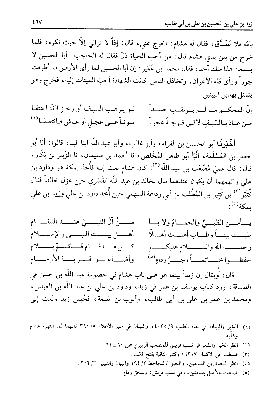بالله فلا يصدق فقال له هشام اخرج عني قال إذا لا تراني إلا حيث تكره فلما خرج من بين يدي هشام قال من أحب الحياة ذل فقال له الحاجب أبا الحسين لا يسمعن هذا منك أحد فقال محمد بن عمير إن أبا الحسين لما رأى الأرض قد أطرقت جورا ورأى قلة الأعوان وتخاذل الناس كانت الشهادة أحب الميتات إليه فخرج وهو يتمثل بهذين البيتين * إن المحكم ما لم يرتقب حسدا * لو يرهب السيف أو وخز القنا هتفا من عاذ بالسيف لاقى فرجة عجبا * موتا على عجل أو عاش فانتصفا * (1) أخبرنا أبو الحسين بن الفراء وأبو غالب وأبو عبد الله ابنا البنا قالوا أنا أبو جعفر بن المسلمة أنبأ أبو طاهر المخلص نا أحمد بن سليمان نا الزبير بن بكار قال قال عمي مصعب بن عبد الله (2) كان هشام بعث إليه فأخذ بمكة هو وداود بن علي واتهمهما أن يكون عندهما مال لخالد بن عبد الله القسري حين عزل خالدا فقال كثير (3) بن كثير بن المطلب بن أبي وداعة السهمي حين أخذ داود بن علي وزيد بن علي بمكة (4) * يأمن الظبي والحمام ولا يأ * من آل النبي عند المقام طبت بيتا وطاب أهلك أهلا * أهل بيت النبي والإسلام رحمة الله والسلام عليكم * كل ما قام قائم بسلام حفظوا خاتما وجر رداء (5) * وأضاعوا قرابة الأرحام * قال ويقال إن زيدا بينما هو على باب هشام في خصومة عبد الله بن حسن في الصدقة ورد كتاب يوسف بن عمر في زيد وداود بن علي بن عبد الله بن العباس ومحمد بن عمر بن علي بن أبي طالب وأيوب بن سلمة فحبس زيد وبعث إلى