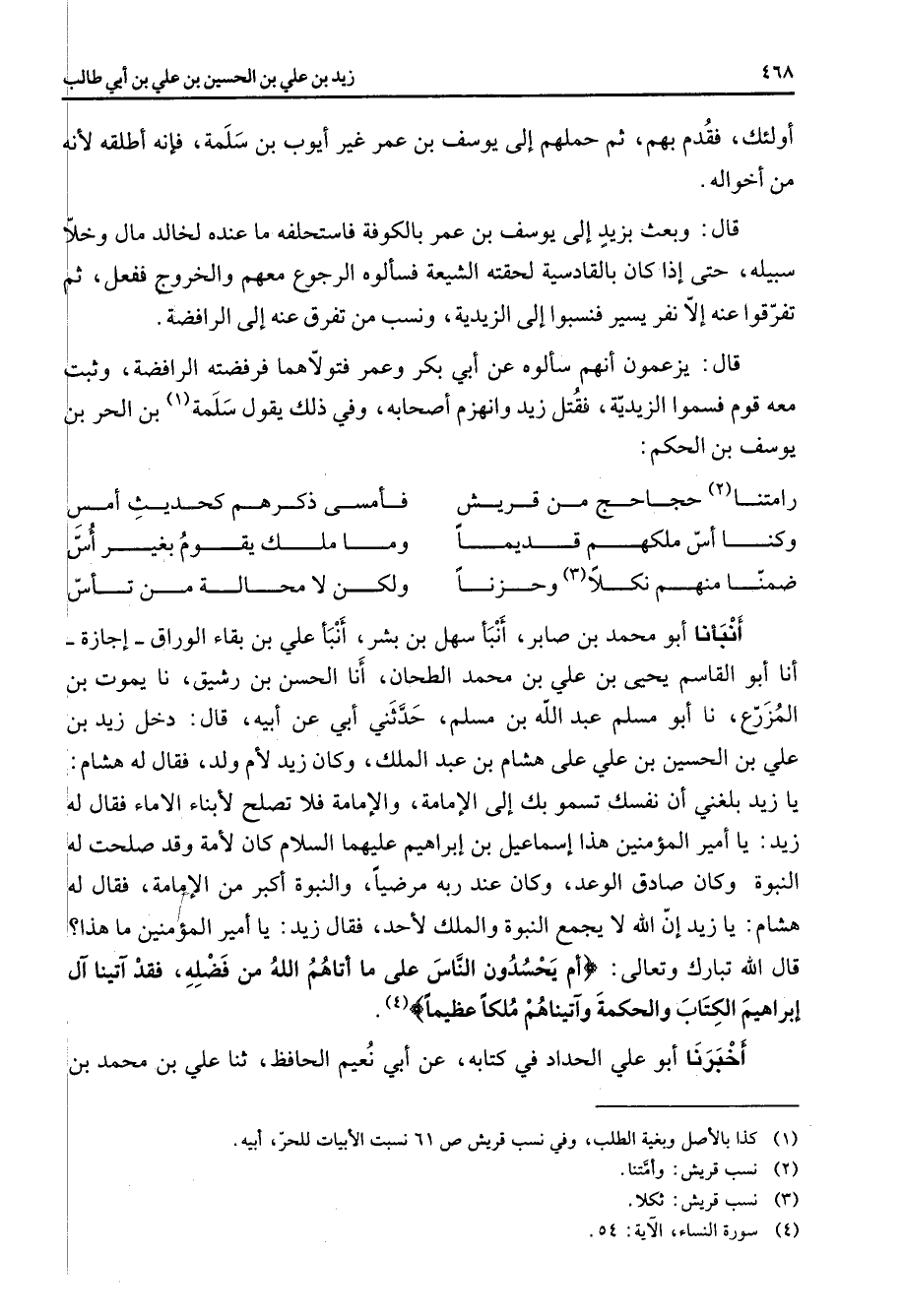 أولئك فقدم بهم ثم حملهم إلى يوسف بن عمر غير أيوب بن سلمة فإنه أطلقه لأنه من أخواله قال وبعث بزيد إلى يوسف بن عمر بالكوفة فاستحلفه ما عنده لخالد مال وخلا سبيله حتى إذا كان بالقادسية لحقته الشيعة فسألوه الرجوع معهم والخروج ففعل ثم تفرقوا عنه إلا نفر يسير فنسبوا إلى الزيدية ونسب من تفرق عنه إلى الرافضة قال يزعمون أنهم سألوه عن أبي بكر وعمر فتولاهما فرفضته الرافضة وثبت معه قوم فسموا الزيدية فقتل زيد وانهزم أصحابه وفي ذلك يقول سلمة (1) بن الحر بن يوسف بن الحكم * رامتنا (2) حجاحج من قريش * فأمسى ذكرهم كحديث أمس وكنا أس ملكهم قديما * وما ملك يقوم بغير أس ضمنا منهم نكلا (3) وحزنا * ولكن لا محالة من تأس * أنبأنا أبو محمد بن صابر أنبأ سهل بن بشر أنبأ علي بن بقاء الوراق إجازة أنا أبو القاسم يحيى بن علي بن محمد الطحان أنا الحسن بن رشيق نا يموت بن المزرع نا أبو مسلم عبد الله بن مسلم حدثني أبي عن أبيه قال دخل زيد بن علي بن الحسين بن علي على هشام بن عبد الملك وكان زيد لأم ولد فقال له هشام يا زيد بلغني أن نفسك تسمو بك إلى الإمامة والإمامة فلا تصلح لأبناء الاماء فقال له زيد يا أمير المؤمنين هذا إسماعيل بن إبراهيم عليهما السلام كان لأمة وقد صلحت له النبوة وكان صادق الوعد وكان عند ربه مرضيا والنبوة أكبر من الإمامة فقال له هشام يا زيد إن الله لا يجمع النبوة والملك لأحد فقال زيد يا أمير المؤمنين ما هذا قال الله تبارك وتعالى " أم يحسدون الناس على ما أتاهم الله من فضله فقد آتينا آل إبراهيم الكتاب والحكمة وآتيناهم ملكا عظيما " (4) أخبرنا أبو علي الحداد في كتابه عن أبي نعيم الحافظ ثنا علي بن محمد بن