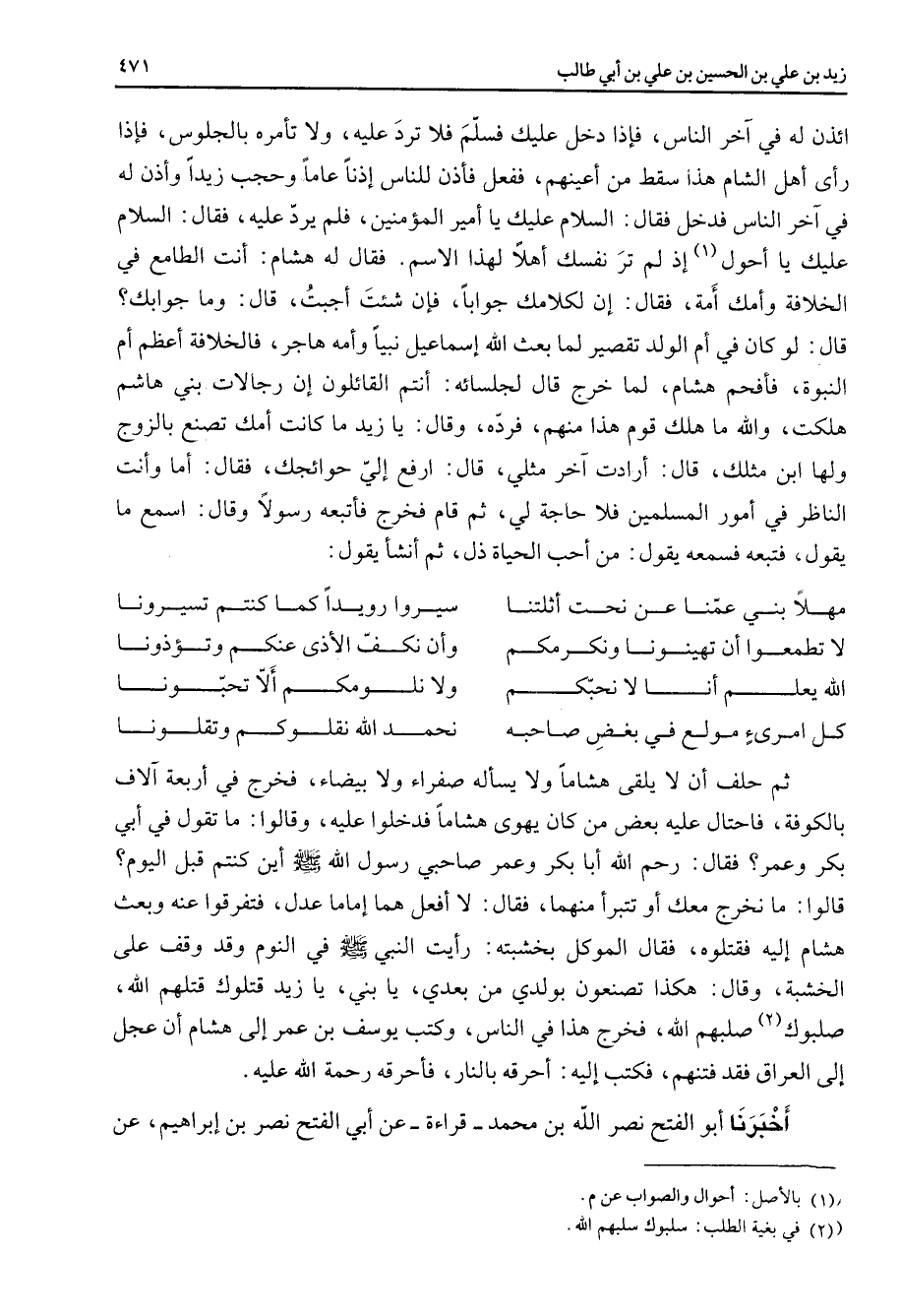ائذن له في آخر الناس فإذا دخل عليك فسلم فلا ترد عليه ولا تأمره بالجلوس فإذا رأى أهل الشام هذا سقط من أعينهم ففعل فأذن للناس إذنا عاما وحجب زيدا وأذن له في آخر الناس فدخل فقال السلام عليك يا أمير المؤمنين فلم يرد عليه فقال السلام عليك يا أحول (1) إذ لم تر نفسك أهلا لهذا الاسم فقال له هشام أنت الطامع في الخلافة وأمك أمة فقال إن لكلامك جوابا فإن شئت أجبت قال وما جوابك قال لو كان في أم الولد تقصير لما بعث الله إسماعيل نبيا وأمه هاجر فالخلافة أعظم أم النبوة فأفحم هشام لما خرج قال لجلسائه أنتم القائلون إن رجالات بني هاشم هلكت والله ما هلك قوم هذا منهم فرده وقال يا زيد ما كانت أمك تصنع بالزوج ولها ابن مثلك قال أرادت آخر مثلي قال ارفع إلي حوائجك فقال أما وأنت الناظر في أمور المسلمين فلا حاجة لي ثم قام فخرج فأتبعه رسولا وقال اسمع ما يقول فتبعه فسمعه يقول من أحب الحياة ذل ثم أنشأ يقول * مهلا بني عمنا عن نحت أثلتنا * سيروا رويدا كما كنتم تسيرونا لا تطمعوا أن تهينونا ونكرمكم * وأن نكف الأذى عنكم وتؤذونا الله يعلم أنا لا نحبكم * ولا نلومكم ألا تحبونا كل امرئ مولع في بغض صاحبه * نحمد الله نقلوكم وتقلونا * ثم حلف أن لا يلقى هشاما ولا يسأله صفراء ولا بيضاء فخرج في أربعة آلاف بالكوفة فاحتال عليه بعض من كان يهوى هشاما فدخلوا عليه وقالوا ما تقول في أبي بكر وعمر فقال رحم الله أبا بكر وعمر صاحبي رسول الله ص - أين كنتم قبل اليوم قالوا ما نخرج معك أو تتبرأ منهما فقال لا أفعل هما إماما عدل فتفرقوا عنه وبعث هشام إليه فقتلوه فقال الموكل بخشبته رأيت النبي ص - في النوم وقد وقف على الخشبة وقال هكذا تصنعون بولدي من بعدي يا بني يا زيد قتلوك قتلهم الله صلبوك (2) صلبهم الله فخرج هذا في الناس وكتب يوسف بن عمر إلى هشام أن عجل إلى العراق فقد فتنهم فكتب إليه أحرقه بالنار فأحرقه رحمة الله عليه أخبرنا أبو الفتح نصرالله بن محمد قراءة عن أبي الفتح نصر بن إبراهيم عن