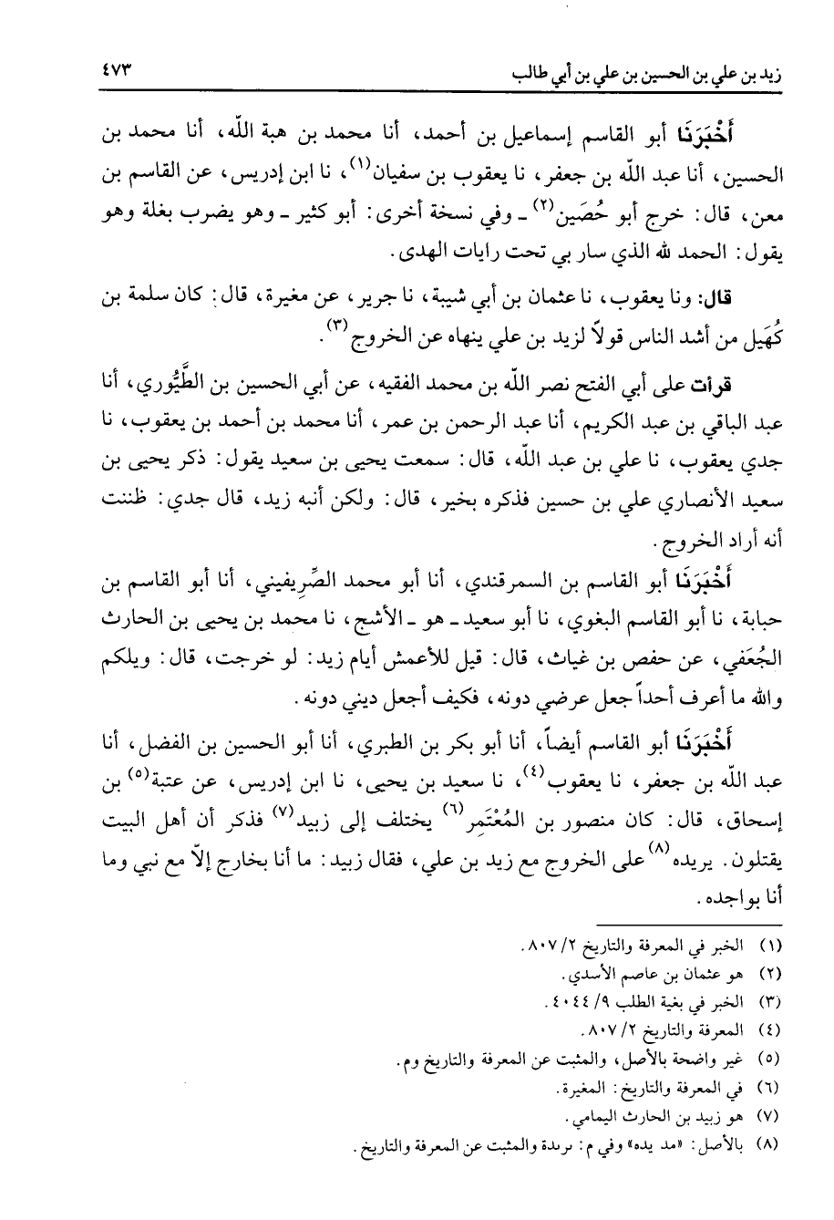 أخبرنا أبو القاسم إسماعيل بن أحمد أنا محمد بن هبة الله أنا محمد بن الحسين أنا عبد الله بن جعفر نا يعقوب بن سفيان (1) نا ابن إدريس عن القاسم بن معن قال خرج أبو حصين (2) وفي نسخة أخرى أبو كثير وهو يضرب بغلة وهو يقول الحمد لله الذي سار بي تحت رايات الهدى قال ونا يعقوب نا عثمان بن أبي شيبة نا جرير عن مغيرة قال كان سلمة بن كهيل من أشد الناس قولا لزيد بن علي ينهاه عن الخروج (3) قرأت على أبي الفتح نصر الله بن محمد الفقيه عن أبي الحسين بن الطيوري أنا عبد الباقي بن عبد الكريم أنا عبد الرحمن بن عمر أنا محمد بن أحمد بن يعقوب نا جدي يعقوب نا علي بن عبد الله قال سمعت يحيى بن سعيد يقول ذكر يحيى بن سعيد الأنصاري علي بن حسين فذكره بخير قال ولكن أنبه زيد قال جدي ظننت أنه أراد الخروج أخبرنا أبو القاسم بن السمرقندي أنا أبو محمد الصريفيني أنا أبو القاسم بن حبابة نا أبو القاسم البغوي نا أبو سعيد هو الأشج نا محمد بن يحيى بن الحارث الجعفي عن حفص بن غياث قال قيل للأعمش أيام زيد لو خرجت قال ويلكم والله ما أعرف أحدا جعل عرضي دونه فكيف أجعل ديني دونه أخبرنا أبو القاسم أيضا أنا أبو بكر بن الطبري أنا أبو الحسين بن الفضل أنا عبد الله بن جعفر نا يعقوب (4) نا سعيد بن يحيى نا ابن إدريس عن عتبة (5) بن إسحاق قال كان منصور بن المعتمر (6) يختلف إلى زبيد (7) فذكر أن أهل البيت يقتلون يريده (8) على الخروج مع زيد بن علي فقال زبيد ما أنا بخارج إلا مع نبي وما أنا بواجده