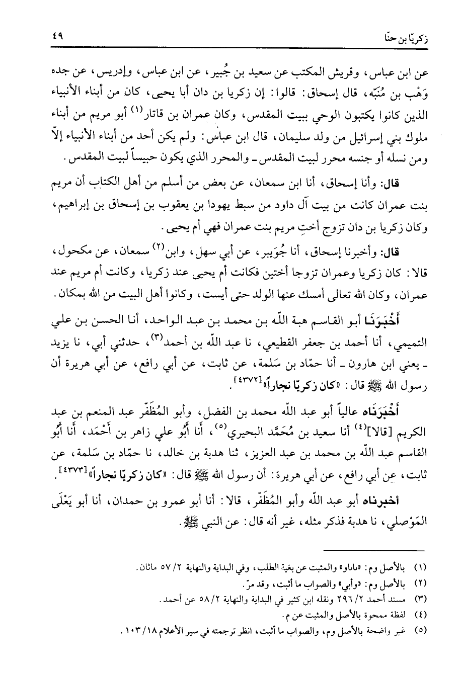 عن ابن عباس وقريش المكتب عن سعيد بن جبير عن ابن عباس وإدريس عن جده وهب بن منبه قال إسحاق قالوا إن زكريا بن دان أبا يحيى كان من أبناء الأنبياء الذين كانوا يكتبون الوحي ببيت المقدس وكان عمران بن قاتار (1) أبو مريم من أبناء ملوك بني إسرائيل من ولد سليمان قال ابن عباس ولم يكن أحد من أبناء الأنبياء إلا ومن نسله أو جنسه محرر لبيت المقدس والمحرر الذي يكون حبيسا لبيت المقدس قال وأنا إسحاق أنا ابن سمعان عن بعض من أسلم من أهل الكتاب أن مريم بنت عمران كانت من بيت آل داود من سبط يهودا بن يعقوب بن إسحاق بن إبراهيم وكان زكريا بن دان تزوج أخت مريم بنت عمران فهي أم يحيى قال وأخبرنا إسحاق أنا جويبر عن أبي سهل وابن (2) سمعان عن مكحول قالا كان زكريا وعمران تزوجا أختين فكانت أم يحيى عند زكريا وكانت أم مريم عند عمران وكان الله تعالى أمسك عنها الولد حتى أيست وكانوا أهل البيت من الله بمكان أخبرنا أبو القاسم هبة الله بن محمد بن عبد الواحد أنا الحسن بن علي التميمي أنا أحمد بن جعفر القطيعي نا عبد الله بن أحمد (3) حدثني أبي نا يزيد يعني ابن هارون أنا حماد بن سلمة عن ثابت عن أبي رافع عن أبي هريرة أن رسول الله (صلى الله عليه وسلم) قال كان زكريا نجارا