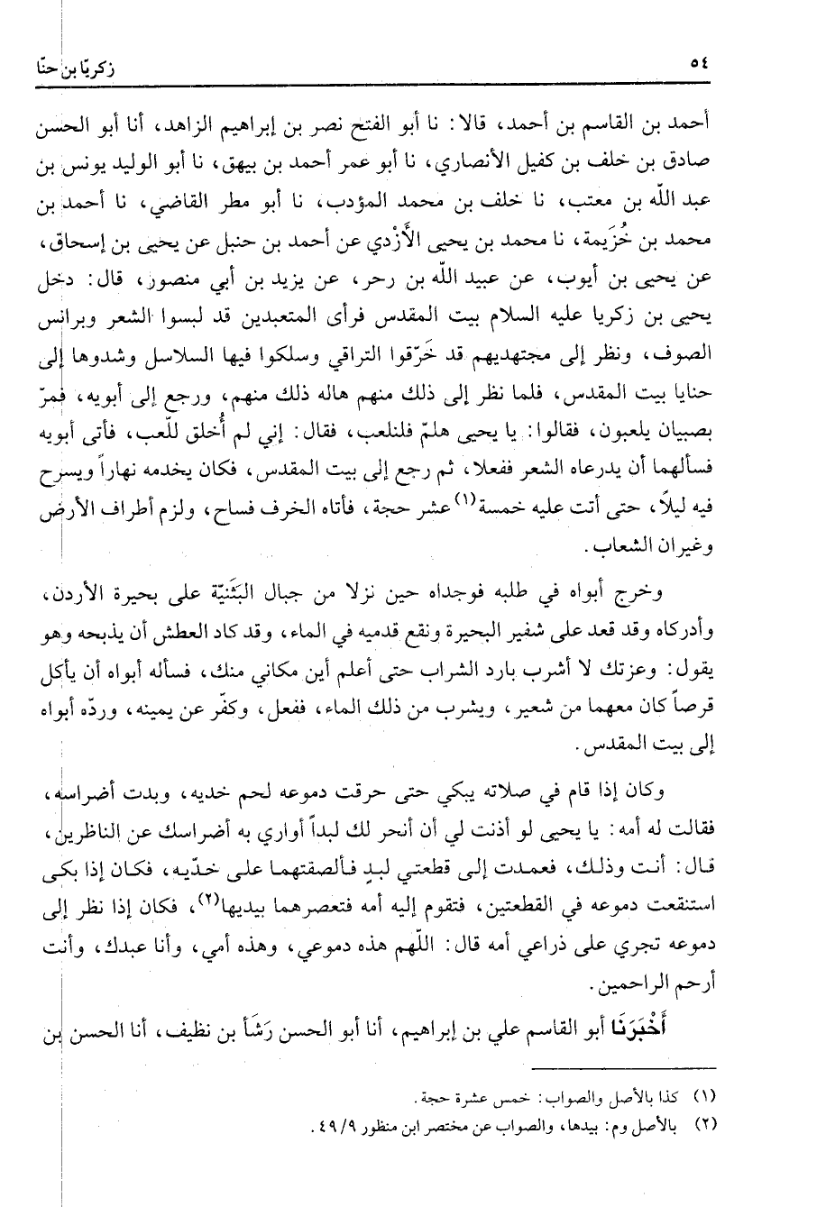 أحمد بن القاسم بن أحمد قالا نا أبو الفتح نصر بن إبراهيم الزاهد أنا أبو الحسن صادق بن خلف بن كفيل الأنصاري نا أبو عمر أحمد بن بيهق نا أبو الوليد يونس بن عبد الله بن معتب نا خلف بن محمد المؤدب نا أبو مطر القاضي نا أحمد بن محمد بن خزيمة نا محمد بن يحيى الأزدي عن أحمد بن حنبل عن يحيى بن أسحاق عن يحيى بن أيوب عن عبيد الله بن رحر عن يزيد بن أبي منصور قال دخل يحيى بن زكريا عليه السلام بيت المقدس فرأى المتعبدين قد لبسوا الشعر وبرانس الصوف ونظر إلى مجتهديهم قد خرقوا التراقي وسلكوا فيها السلاسل وشدوها إلى حنايا بيت المقدس فلما نظر إلى ذلك منهم هاله ذلك منهم ورجع إلى أبويه فمر بصبيان يلعبون فقالوا يا يحيى هلم فلنلعب فقال إني لم أخلق للعب فأتى أبويه فسألهما أن يدرعاه الشعر ففعلا ثم رجع إلى بيت المقدس فكان يخدمه نهارا ويسرح فيه ليلا حتى أتت عليه خمسة (1) عشر حجة فأتاه الخرف فساح ولزم أطراف الأرض وغيران الشعاب وخرج أبواه في طلبه فوجداه حين نزلا من جبال البثنية على بحيرة الأردن وأدركاه وقد قعد على شفير البحيرة ونقع قدميه في الماء وقد كاد العطش أن يذبحه وهو يقول وعزتك لا أشرب بارد الشراب حتى أعلم أين مكاني منك فسأله أبواه أن يأكل قرصا كان معهما من شعير ويشرب من ذلك الماء ففعل وكفر عن يمينه ورده أبواه إلى بيت المقدس وكان إذا قام في صلاته يبكي حتى حرقت دموعه لحم خديه وبدت أضراسه فقالت له أمه يا يحيى لو أذنت لي أن أنحر لك لبدا أواري به أضراسك عن الناظرين قال أنت وذلك فعمدت إلى قطعتي لبد فألصقتهما على خديه فكان إذا بكى استنقعت دموعه في القطعتين فتقوم إليه أمه فتعصرهما بيديها (2) فكان إذا نظر إلى دموعه تجري على ذراعي أمه قال اللهم هذه دموعي وهذه أمي وأنا عبدك وأنت أرحم الراحمين أخبرنا أبو القاسم علي بن إبراهيم أنا أبو الحسن رشأ بن نظيف أنا الحسن بن