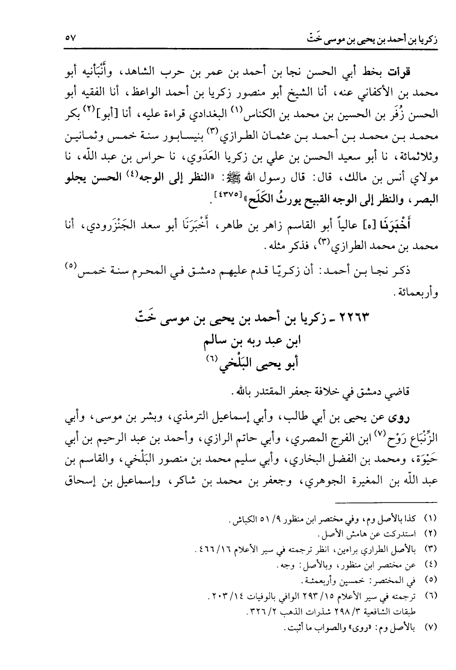 2263 - زكريا بن أحمد بن يحيى بن موسى خت ابن عبد ربه بن سالم أبو يحيى البلخي (6) قاضي دمشق في خلافة جعفر المقتدر بالله روى عن يحيى بن أبي طالب وأبي إسماعيل الترمذي وبشر بن موسى وأبي الزنباع روح (7) ابن الفرج المصري وأبي حاتم الرازي وأحمد بن عبد الرحيم بن أبي حيوة ومحمد بن الفضل البخاري وأبي سليم محمد بن منصور البلخي والقاسم بن عبد الله بن المغيرة الجوهري وجعفر بن محمد بن شاكر وإسماعيل بن إسحاق