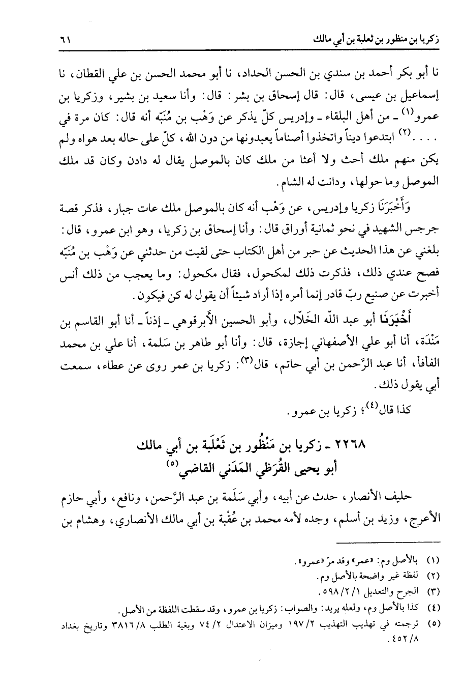 2268 - زكريا بن منظور بن ثعلبة بن أبي مالك أبو يحيى القرظي المدني القاضي (5) حليف الأنصار حدث عن أبيه وأبي سلمة بن عبد الرحمن ونافع وأبي حازم الأعرج وزيد بن أسلم وجده لأمه محمد بن عقبة بن أبي مالك الأنصاري وهشام بن