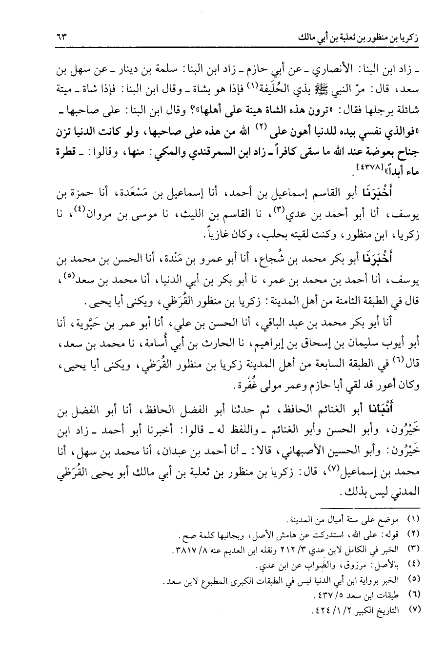 [4378] أخبرنا أبو القاسم إسماعيل بن أحمد أنا إسماعيل بن مسعدة أنا حمزة بن يوسف أنا أبو أحمد بن عدي (3) نا القاسم بن الليث نا موسى بن مروان (4) نا زكريا ابن منظور وكنت لقيته بحلب وكان غازيا أخبرنا أبو بكر محمد بن شجاع أنا أبو عمرو بن مندة أنا الحسن بن محمد بن يوسف أنا أحمد بن محمد بن عمر نا أبو بكر بن أبي الدنيا أنا محمد بن سعد (5) قال في الطبقة الثامنة من أهل المدينة زكريا بن منظور القرظي ويكنى أبا يحيى أنا أبو بكر محمد بن عبد الباقي أنا الحسن بن علي أنا أبو عمر بن حيوية أنا أبو أيوب سليمان بن إسحاق بن إبراهيم نا الحارث بن أبي أسامة نا محمد بن سعد قال (6) في الطبقة السابعة من أهل المدينة زكريا بن منظور القرظي ويكنى أبا يحيى وكان أعور قد لقي أبا حازم وعمر مولى غفرة أنبأنا أبو الغنائم الحافظ ثم حدثنا أبو الفضل الحافظ أنا أبو الفضل بن خيرون وأبو الحسن وأبو الغنائم واللفظ له قالوا أخبرنا أبو أحمد زاد ابن خيرون وأبو الحسين الأصبهاني قالا أنا أحمد بن عبدان أنا محمد بن سهل أنا محمد بن إسماعيل (7) قال زكريا بن منظور بن ثعلبة بن أبي مالك أبو يحيى القرظي المدني ليس بذلك