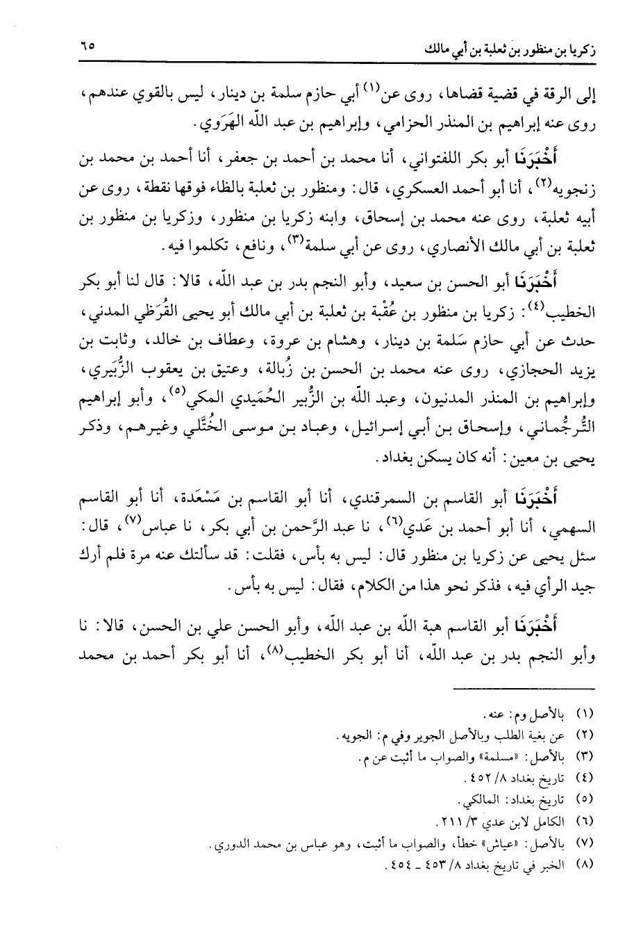 إلى الرقة في قضية قضاها روى عن (1) أبي حازم سلمة بن دينار ليس بالقوي عندهم روى عنه إبراهيم بن المنذر الحزامي وإبراهيم بن عبد الله الهروي أخبرنا أبو بكر اللفتواني أنا محمد بن أحمد بن جعفر أنا أحمد بن محمد بن زنجويه (2) أنا أبو أحمد العسكري قال ومنظور بن ثعلبة بالظاء فوقها نقطة روى عن أبيه ثعلبة روى عنه محمد بن إسحاق وابنه زكريا بن منظور وزكريا بن منظور بن ثعلبة بن أبي مالك الأنصاري روى عن أبي سلمة ونافع تكلموا فيه أخبرنا أبو الحسن بن سعيد وأبو النجم بدر بن عبد الله قالا قال لنا أبو بكر الخطيب (4) زكريا بن منظور بن عقبة بن ثعلبة بن أبي مالك أبو يحيى القرظي المدني حدث عن أبي حازم سلمة بن دينار وهشام بن عروة وعطاف بن خالد وثابت بن يزيد الحجازي روى عنه محمد بن الحسن بن زبالة وعتيق بن يعقوب الزبيري وإبراهيم بن المنذر المدنيون وعبد الله بن الزبير الحميدي المكي (5) وأبو إبراهيم الترجماني وإسحاق بن أبي إسرائيل وعباد بن موسى الختلي وغيرهم وذكر يحيى بن معين أنه كان يسكن بغداد أخبرنا أبو القاسم بن السمرقندي أنا أبو القاسم بن مسعدة أنا أبو القاسم السهمي أنا أبو أحمد بن عدي (6) نا عبد الرحمن بن أبي بكر نا عباس (7) قال سئل يحيى عن زكريا بن منظور قال ليس به بأس فقلت قد سألتك عنه مرة فلم أرك جيد الرأي فيه فذكر نحو هذا من الكلام فقال ليس به بأس أخبرنا أبو القاسم هبة الله بن عبد الله وأبو الحسن علي بن الحسن قالا نا وأبو النجم بدر بن عبد الله أنا أبو بكر الخطيب (8) أنا أبو بكر أحمد بن محمد