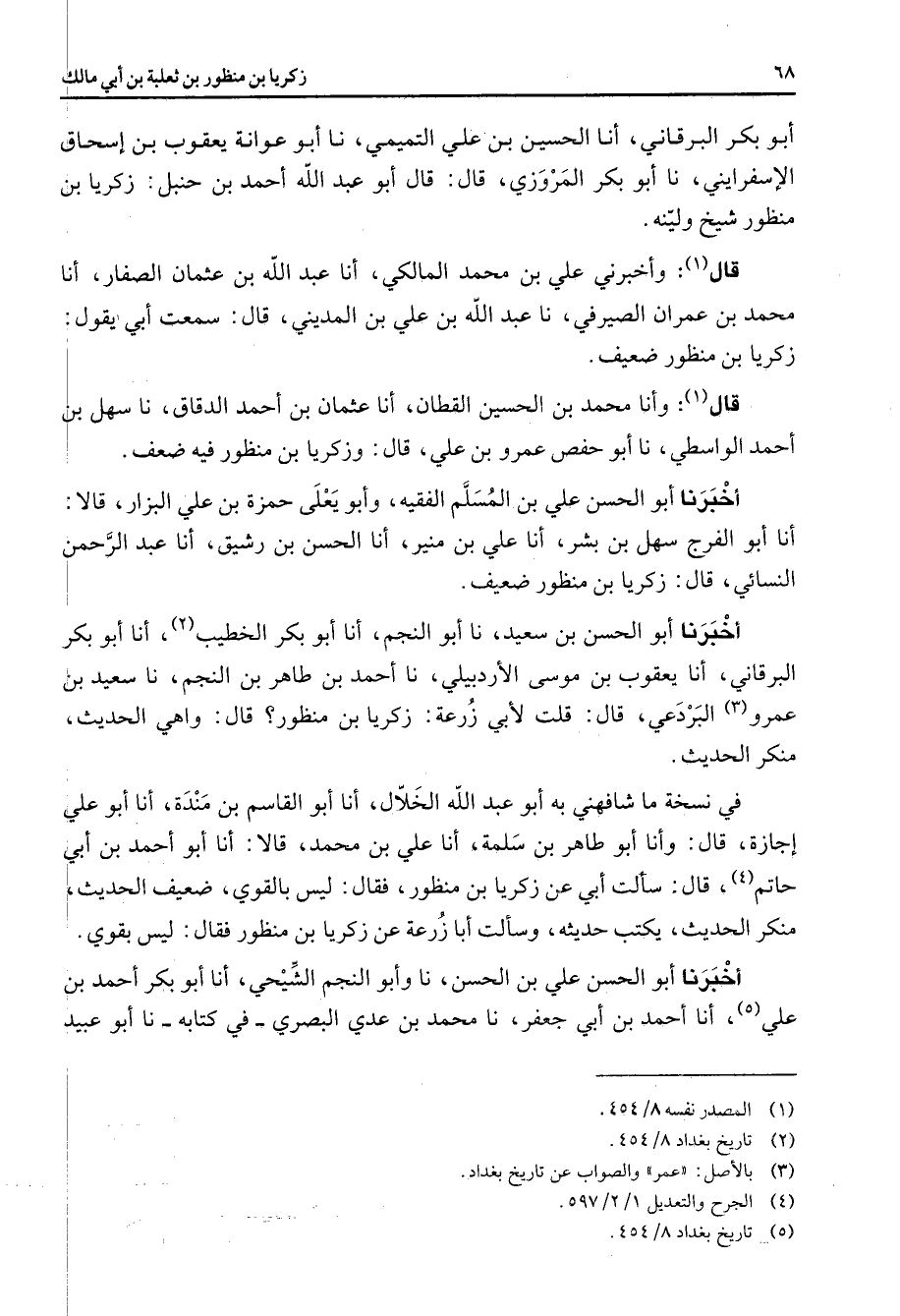 أبو بكر البرقاني أنا الحسين بن علي التميمي نا أبو عوانة يعقوب بن إسحاق الإسفرايني نا أبو بكر المروزي قال قال أبو عبد الله أحمد بن حنبل زكريا بن منظور شيخ ولينه قال (1) وأخبرني علي بن محمد المالكي أنا عبد الله بن عثمان الصفار أنا محمد بن عمران الصيرفي نا عبد الله بن علي بن المديني قال سمعت أبي يقول زكريا بن منظور ضعيف قال (1) وأنا محمد بن الحسين القطان أنا عثمان بن أحمد الدقاق نا سهل بن أحمد الواسطي نا أبو حفص عمرو بن علي قال وزكريا بن منظور فيه ضعف أخبرنا أبو الحسن علي بن المسلم الفقيه وأبو يعلى حمزة بن علي البزار قالا أنا أبو الفرج سهل بن بشر أنا علي بن منير أنا الحسن بن رشيق أنا عبد الرحمن النسائي قال زكريا بن منظور ضعيف أخبرنا أبو الحسن بن سعيد نا أبو النجم أنا أبو بكر الخطيب (2) أنا أبو بكر البرقاني أنا يعقوب بن موسى الأردبيلي نا أحمد بن طاهر بن النجم نا سعيد بن عمرو (3) البردعي قال قلت لأبي زرعة زكريا بن منظور قال واهي الحديث منكر الحديث في نسخة ما شافهني به أبو عبد الله الخلال أنا أبو القاسم بن مندة أنا أبو علي إجازة قال وأنا أبو طاهر بن سلمة أنا علي بن محمد قالا أنا أبو أحمد بن أبي حاتم (4) قال سألت أبي عن زكريا بن منظور فقال ليس بالقوي ضعيف الحديث منكر الحديث يكتب حديثه وسألت أبا زرعة عن زكريا بن منظور فقال ليس بقوي