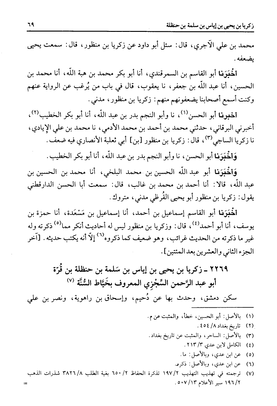 2269 - زكريا بن يحيى بن إياس بن سلمة بن حنظلة بن قرة أبو عبد الرحمن السجزي المعروف بخياط السنة (7) سكن دمشق وحدث بها عن دحيم وإسحاق بن راهوية ونصر بن علي