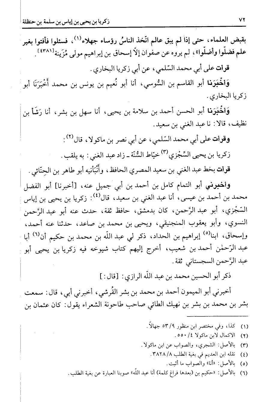[4381] قرأت على أبي محمد السلمي عن أبي زكريا البخاري وأخبرنا أبو القاسم بن السوسي أنا أبو نعيم بن يونس بن محمد أخبرنا أبو زكريا البخاري وأخبرنا أبو الحسن أحمد بن سلامة بن يحيى أنا سهل بن بشر أنا رشأ بن نظيف قالا نا عبد الغني بن سعيد وقرأت على أبي محمد السلمي عن أبي نصر بن ماكولا قال (2) زكريا بن يحيى السجزي (3) خياط السنة زاد عبد الغني به يلقب قرأت بخط عبد الغني بن سعيد المصري الحافظ وأنبأنيه أبو طاهر بن الحنائي وأخبرني أبو التمام كامل بن أحمد بن أبي جميل عنه أخبرنا أبو الفضل محمد بن أحمد بن عيسى أنا عبد الغني بن سعيد قال (4) زكريا بن يحيى بن إياس السجزي أبو عبد الرحمن كان بدمشق حافظ ثقة حدث عنه أبو عبد الرحمن النسوي وأبو يعقوب المنجنيقي ويحيى بن محمد بن صاعد حدثنا عنه أحمد وإسحاق ابنا (5) إبراهيم بن الحداد ذكر لي عبد الله بن محمد بن حكيم أن (6) أبا عبد الرحمن أحمد بن شعيب أخرج إليهم كتاب شيوخه فيه زكريا بن يحيى أبو عبد الرحمن السجستاني ثقة ذكر أبو الحسين محمد بن عبد الله الرازي قال أخبرني أبو الميمون أحمد بن محمد بن بشر القرشي أخبرني أبي قال سمعت بشر بن محمد بن بشر بن نهيك الطائي صاحب طاحونة الشعراء يقول كان عثمان بن