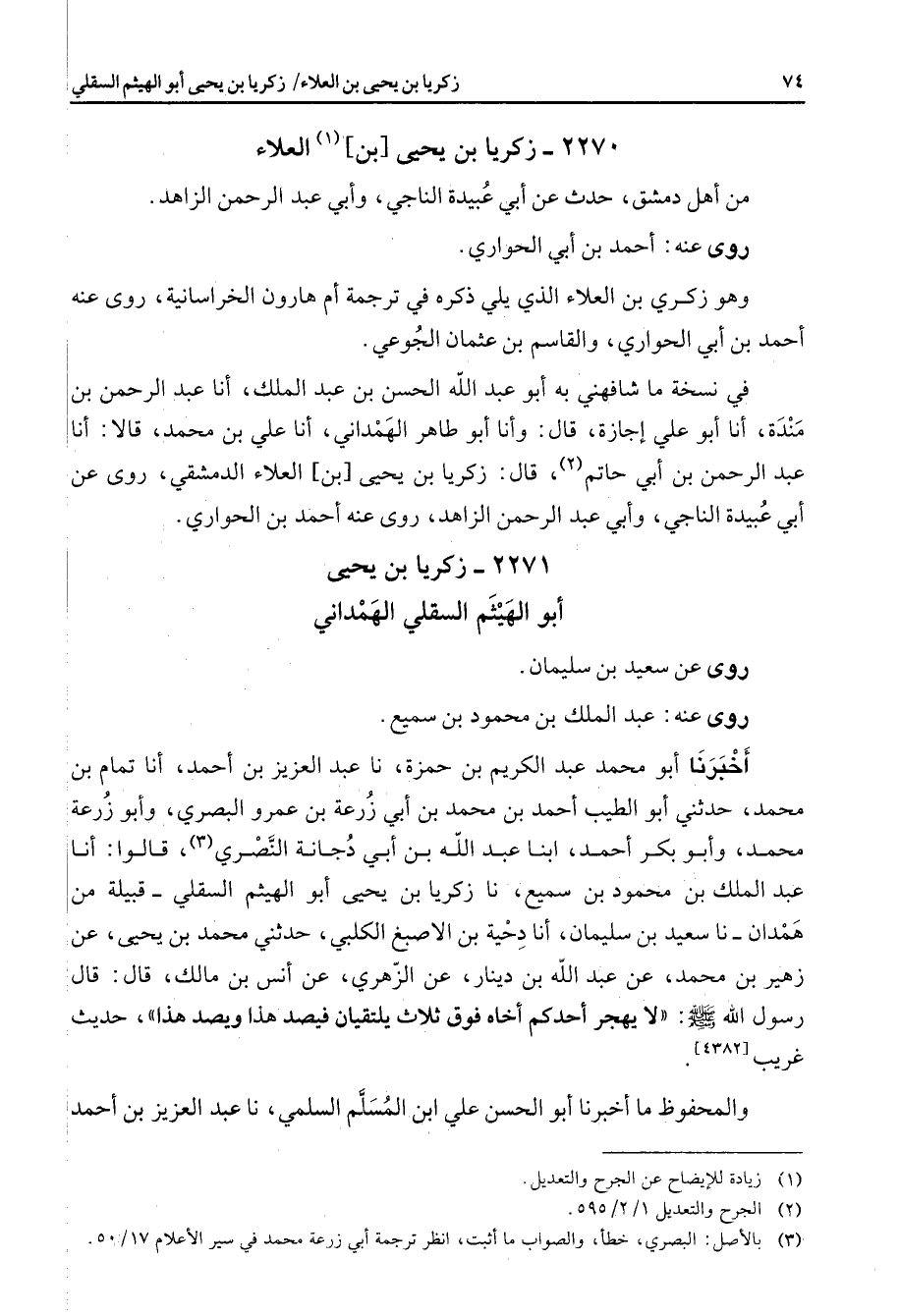 2270 - زكريا بن يحيى بن (1) العلاء من أهل دمشق حدث عن أبي عبيدة الناجي وأبي عبد الرحمن الزاهد روى عنه أحمد بن أبي الحواري وهو زكريا بن العلاء الذي يلي ذكره في ترجمة أم هارون الخراسانية روى عنه أحمد بن أبي الحواري والقاسم بن عثمان الجوعي في نسخة ما شافهني به أبو عبد الله الحسن بن عبد الملك أنا عبد الرحمن بن مندة أنا أبو علي إجازة قال وأنا أبو طاهر الهمداني أنا علي بن محمد قالا أنا عبد الرحمن بن أبي حاتم (2) قال زكريا بن يحيى بن العلاء الدمشقي روى عن أبي عبيدة الناجي وأبي عبد الرحمن الزاهد روى عنه أحمد بن الحواري