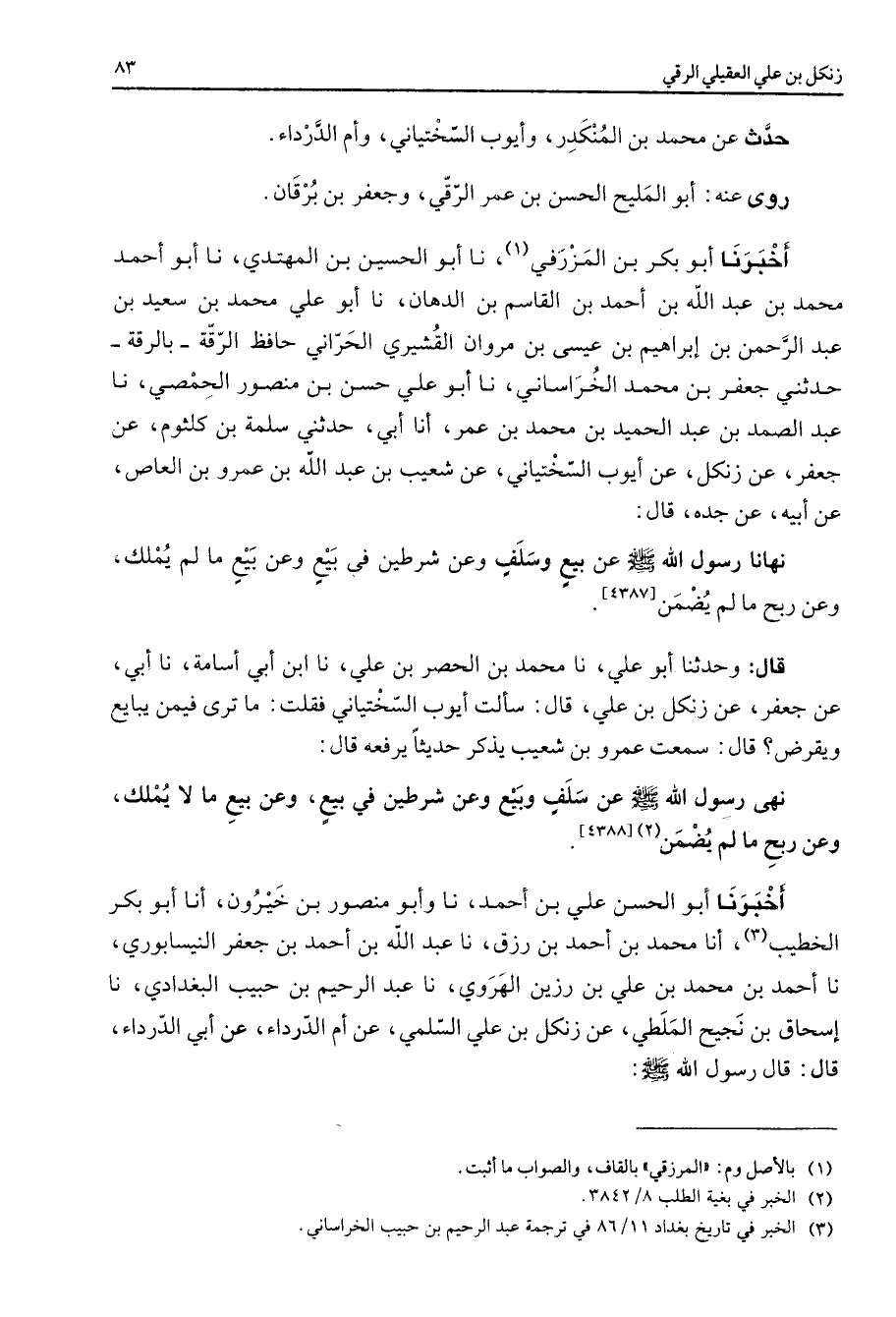 حدث عن محمد بن المنكدر وأيوب السختياني وأم الدرداء روى عنه أبو المليح الحسن بن عمر الرقي وجعفر بن برقان أخبرنا أبو بكر بن المزرفي (1) نا أبو الحسين بن المهتدي نا أبو أحمد محمد بن عبد الله بن أحمد بن القاسم بن الدهان نا أبو علي محمد بن سعيد بن عبد الرحمن بن إبراهيم بن عيسى بن مروان القشيري الحراني حافظ الرقة بالرقة حدثني جعفر بن محمد الخراساني نا أبو علي حسن بن منصور الحمصي نا عبد الصمد بن عبد الحميد بن محمد بن عمر أنا أبي حدثني سلمة بن كلثوم عن جعفر عن زنكل عن أيوب السختياني عن شعيب بن عبد الله بن عمرو بن العاص عن أبيه عن جده قال نهانا رسول الله (صلى الله عليه وسلم) عن بيع وسلف وعن شرطين في بيع وعن بيع ما لم يملك وعن ربح ما لم يضمن
