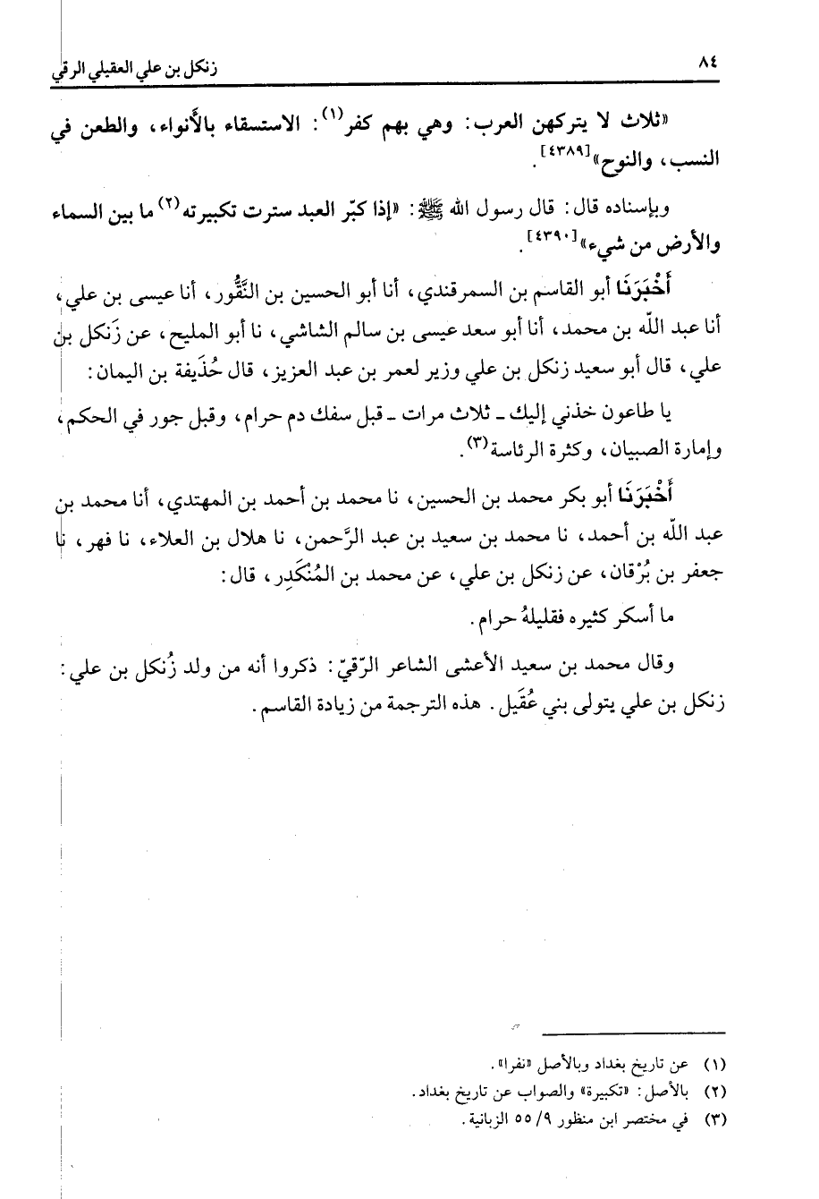 [4390] أخبرنا أبو القاسم بن السمرقندي أنا أبو الحسين بن النقور أنا عيسى بن علي أنا عبد الله بن محمد أنا أبو سعيد عيسى بن سالم الشاشي نا أبو المليح عن زنكل بن علي قال أبو سعيد زنكل بن علي وزير لعمر بن عبد العزيز قال حذيفة بن اليمان يا طاعون خذني إليك ثلاث مرات قبل سفك دم حرام وقبل جور في الحكم وإمارة الصبيان وكثرة الرئاسة (3) أخبرنا أبو بكر محمد بن الحسين نا محمد بن أحمد بن المهتدي أنا محمد بن عبد الله بن أحمد نا محمد بن سعيد بن عبد الرحمن نا هلال بن العلاء نا فهر نا جعفر بن برقان عن زنكل بن علي عن محمد بن المنكدر قال ما أسكر كثيره فقليله حرام وقال محمد بن سعيد الأعشى الشاعر الرقي ذكروا أنه من ولد زنكل بن علي زنكل بن علي يتولى بني عقيل هذه الترجمة من زيادة القاسم