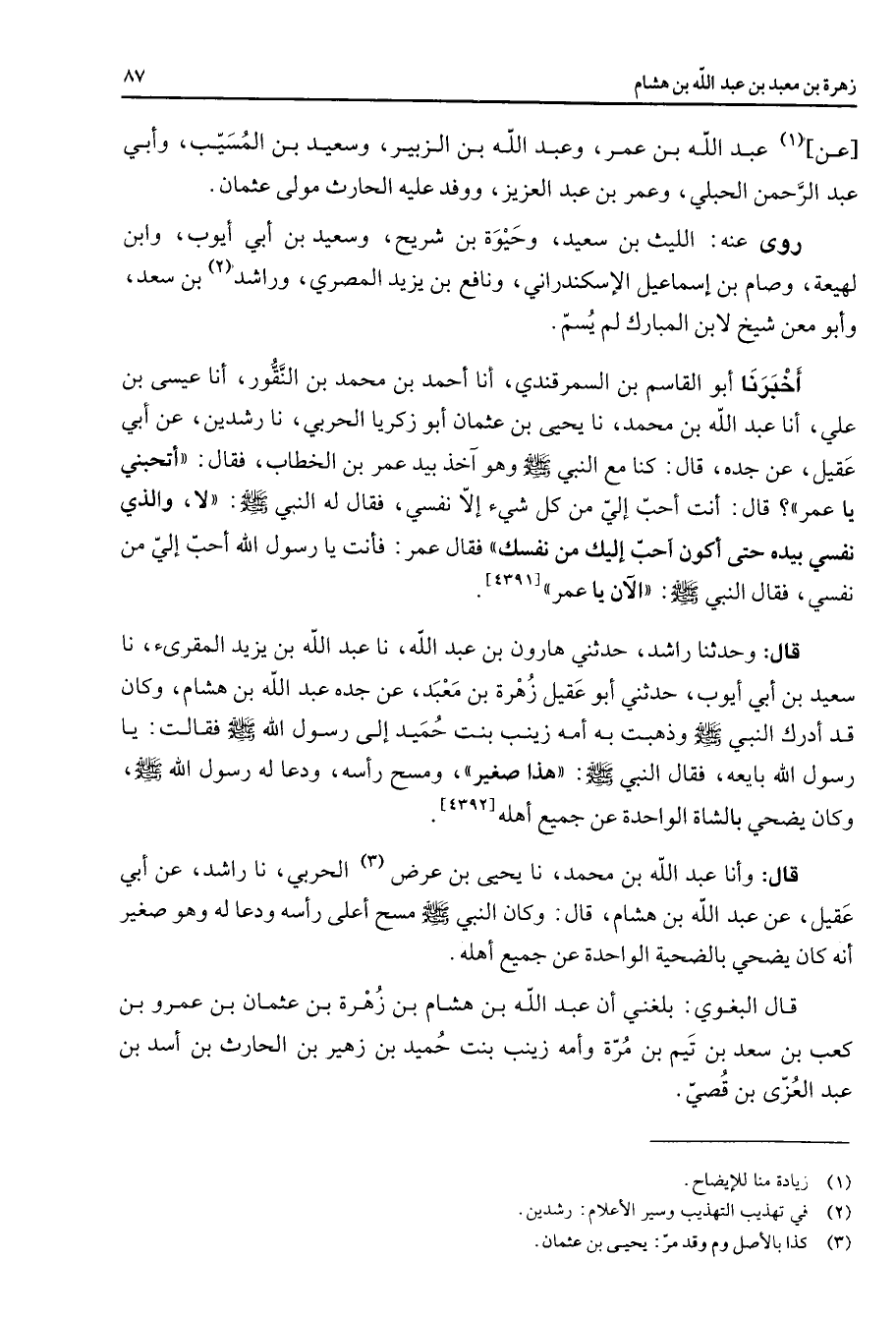 [4392] قال وأنا عبد الله بن محمد نا يحيى بن عرض (3) الحربي نا راشد عن أبي عقيل عن عبد الله بن هشام قال وكان النبي (صلى الله عليه وسلم) مسح أعلى رأسه ودعا له وهو صغير أنه كان يضحي بالضحية الواحدة عن جميع أهله قال البغوي بلغني أن عبد الله بن هشام بن زهرة بن عثمان بن عمرو بن كعب بن سعد بن تيم بن مرة وأمه زينب بنت حميد بن زهير بن الحارث بن أسد بن عبد العزى بن قصي
