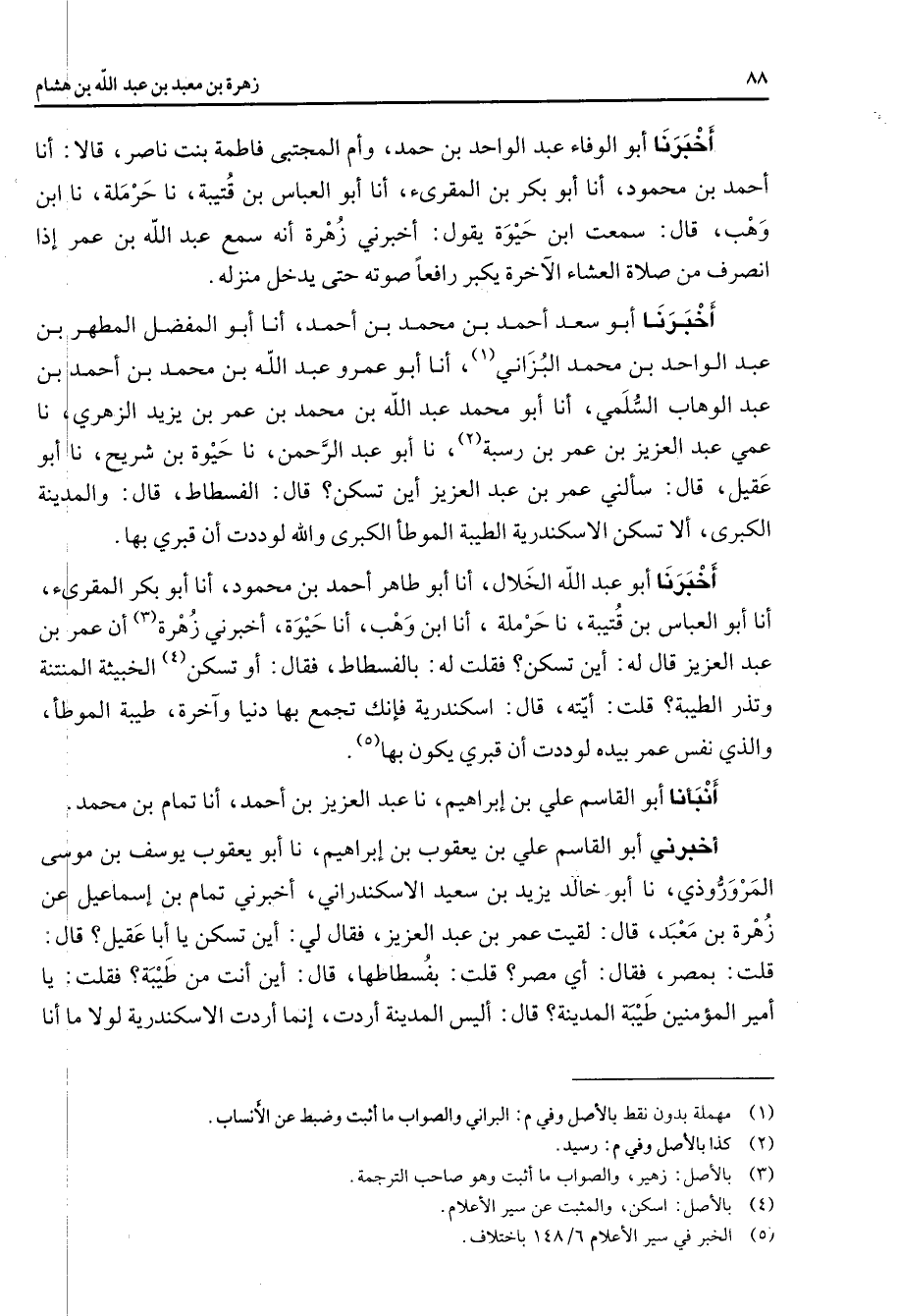 أخبرنا أبو الوفاء عبد الواحد بن حمد وأم المجتبى فاطمة بنت ناصر قالا أنا أحمد بن محمود أنا أبو بكر بن المقرئ أنا أبو العباس بن قتيبة نا حرملة نا ابن وهب قال سمعت ابن حيوة يقول أخبرني زهرة أنه سمع عبد الله بن عمر إذا انصرف من صلاة العشاء الآخرة يكبر رافعا صوته حتى يدخل منزله أخبرنا أبو سعد أحمد بن محمد بن أحمد أنا أبو المفضل المطهر بن عبد الواحد بن محمد البزاني (1) أنا أبو عمرو عبد الله بن محمد بن أحمد بن عبد الوهاب السلمي أنا أبو محمد عبد الله بن محمد بن عمر بن يزيد الزهري نا عمي عبد العزيز بن عمر بن رسبة (2) نا أبو عبد الرحمن نا حيوة بن شريح نا أبو عقيل قال سألني عمر بن عبد العزيز أين تسكن قال الفسطاط قال والمدينة الكبرى ألا تسكن الاسكندرية الطيبة الموطأ الكبرى والله لوددت أن قبري بها أخبرنا أبو عبد الله الخلال أنا أبو طاهر أحمد بن محمود أنا أبو بكر المقرئ أنا أبو العباس بن قتيبة نا حرملة أنا ابن وهب أنا حيوة أخبرني زهرة (3) أن عمر بن عبد العزيز قال له أين تسكن فقلت له بالفسطاط فقال أو تسكن (4) الخبيثة المنتنة وتذر الطيبة قلت أيته قال اسكندرية فإنك تجمع بها دنيا وآخرة طيبة الموطأ والذي نفس عمر بيده لوددت أن قبري يكون بها (5) أنبأنا أبو القاسم علي بن إبراهيم نا عبد العزيز بن أحمد أنا تمام بن محمد أخبرني أبو القاسم علي بن يعقوب بن إبراهيم نا أبو يعقوب يوسف بن موسى المروروذي نا أبو خالد يزيد بن سعيد الاسكندراني أخبرني تمام بن إسماعيل عن زهرة بن معبد قال لقيت عمر بن عبد العزيز فقال لي أين تسكن يا أبا عقيل قال قلت بمصر فقال أي مصر قلت بفسطاطها قال أين أنت من طيبة فقلت يا أمير المؤمنين طيبة المدينة قال أليس المدينة أردت إنما أردت الاسكندرية لولا ما أنا