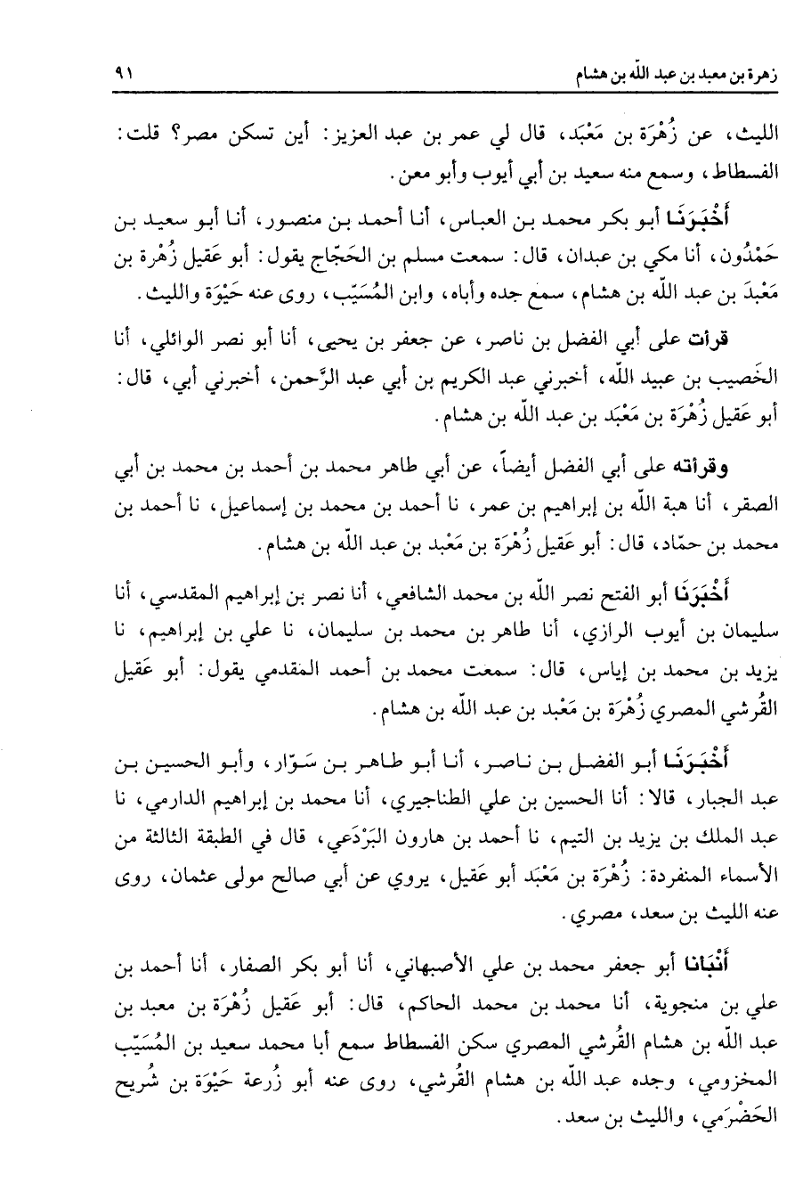 الليث عن زهرة بن معبد قال لي عمر بن عبد العزيز أين تسكن مصر قلت الفسطاط وسمع منه سعيد بن أبي أيوب وأبو معن أخبرنا أبو بكر محمد بن العباس أنا أحمد بن منصور أنا أبو سعيد بن حمدون أنا مكي بن عبدان قال سمعت مسلم بن الحجاج يقول أبو عقيل زهرة بن معبد بن عبد الله بن هشام سمع جده وأباه وابن المسيب روى عنه حيوة والليث قرأت على أبي الفضل بن ناصر عن جعفر بن يحيى أنا أبو نصر الوائلي أنا الخصيب بن عبيد الله أخبرني عبد الكريم بن أبي عبد الرحمن أخبرني أبي قال أبو عقيل زهرة بن معبد بن عبد الله بن هشام وقرأته على أبي الفضل أيضا عن أبي طاهر محمد بن أحمد بن محمد بن أبي الصقر أنا هبة الله بن إبراهيم بن عمر نا أحمد بن محمد بن إسماعيل نا أحمد بن محمد بن حماد قال أبو عقيل زهرة بن معبد بن عبد الله بن هشام اخبرنا أبو الفتح نصر الله بن محمد الشافعي أنا نصر بن إبراهيم المقدسي أنا سليمان بن أيوب الرازي أنا طاهر بن محمد بن سليمان نا علي بن إبراهيم نا يزيد بن محمد بن إياس قال سمعت محمد بن أحمد المقدمي يقول أبو عقيل القرشي المصري زهرة بن معبد بن عبد الله بن هشام اخبرنا أبو الفضل بن ناصر أنا أبو طاهر بن سوار وأبو الحسين بن عبد الجبار قالا أنا الحسين بن علي الطناجيري أنا محمد بن إبراهيم الدارمي نا عبد الملك بن يزيد بن التيم نا أحمد بن هارون البردعي قال في الطبقة الثالثة من الأسماء المنفردة زهرة بن معبد أبو عقيل يروي عن أبي صالح مولى عثمان روى عنه الليث بن سعد مصري أنبأنا أبو جعفر محمد بن علي الأصبهاني أنا أبو بكر الصفار أنا أحمد بن علي بن منجوية أنا محمد بن محمد الحاكم قال أبو عقيل زهرة بن معبد بن عبد الله بن هشام القرشي المصري سكن الفسطاط سمع أبا محمد سعيد بن المسيب المخزومي وجده عبد الله بن هشام القرشي روى عنه أبو زرعة حيوة بن شريح الحضرمي والليث بن سعد