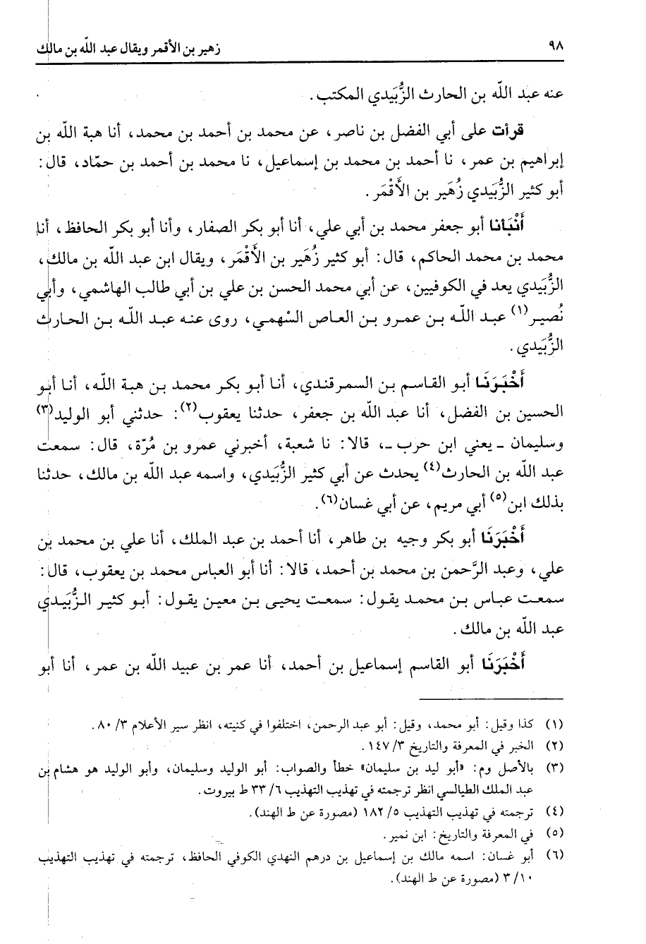 عنه عبد الله بن الحارث الزبيدي المكتب قرأت على أبي الفضل بن ناصر عن محمد بن أحمد بن محمد أنا هبة الله بن إبراهيم بن عمر نا أحمد بن محمد بن إسماعيل نا محمد بن أحمد بن حماد قال أبو كثير الزبيدي زهير بن الأقمر الأقمر أنبأنا أبو جعفر محمد بن أبي علي أنا أبو بكر الصفار وأنا أبو بكر الحافظ أنا محمد بن محمد الحاكم قال أبو كثير زهير بن الأقمر ويقال ابن عبد الله بن مالك الزبيدي يعد في الكوفيين عن أبي محمد الحسن بن علي بن أبي طالب الهاشمي وأبي نصير (1) عبد الله بن عمرو بن العاص السهمي روى عنه عبد الله بن الحارث الزبيدي أخبرنا أبو القاسم بن السمرقندي أنا أبو بكر محمد بن هبة الله أنا أبو الحسين بن الفضل أنا عبد الله بن جعفر حدثنا يعقوب (2) حدثني أبو الوليد (3) وسليمان يعني ابن حرب قالا نا شعبة أخبرني عمرو بن مرة قال سمعت عبد الله بن الحارث (4) يحدث عن أبي كثير الزبيدي واسمه عبد الله بن مالك حدثنا بذلك ابن (5) أبي مريم عن أبي غسان (6) أخبرنا أبو بكر وجيه بن طاهر أنا أحمد بن عبد الملك أنا علي بن محمد بن علي وعبد الرحمن بن محمد بن أحمد قالا أنا أبو العباس محمد بن يعقوب قال سمعت عباس بن محمد يقول سمعت يحيى بن معين يقول أبو كثير الزبيدي عبد الله بن مالك أخبرنا أبو القاسم إسماعيل بن أحمد أنا عمر بن عبيد الله بن عمر أنا أبو