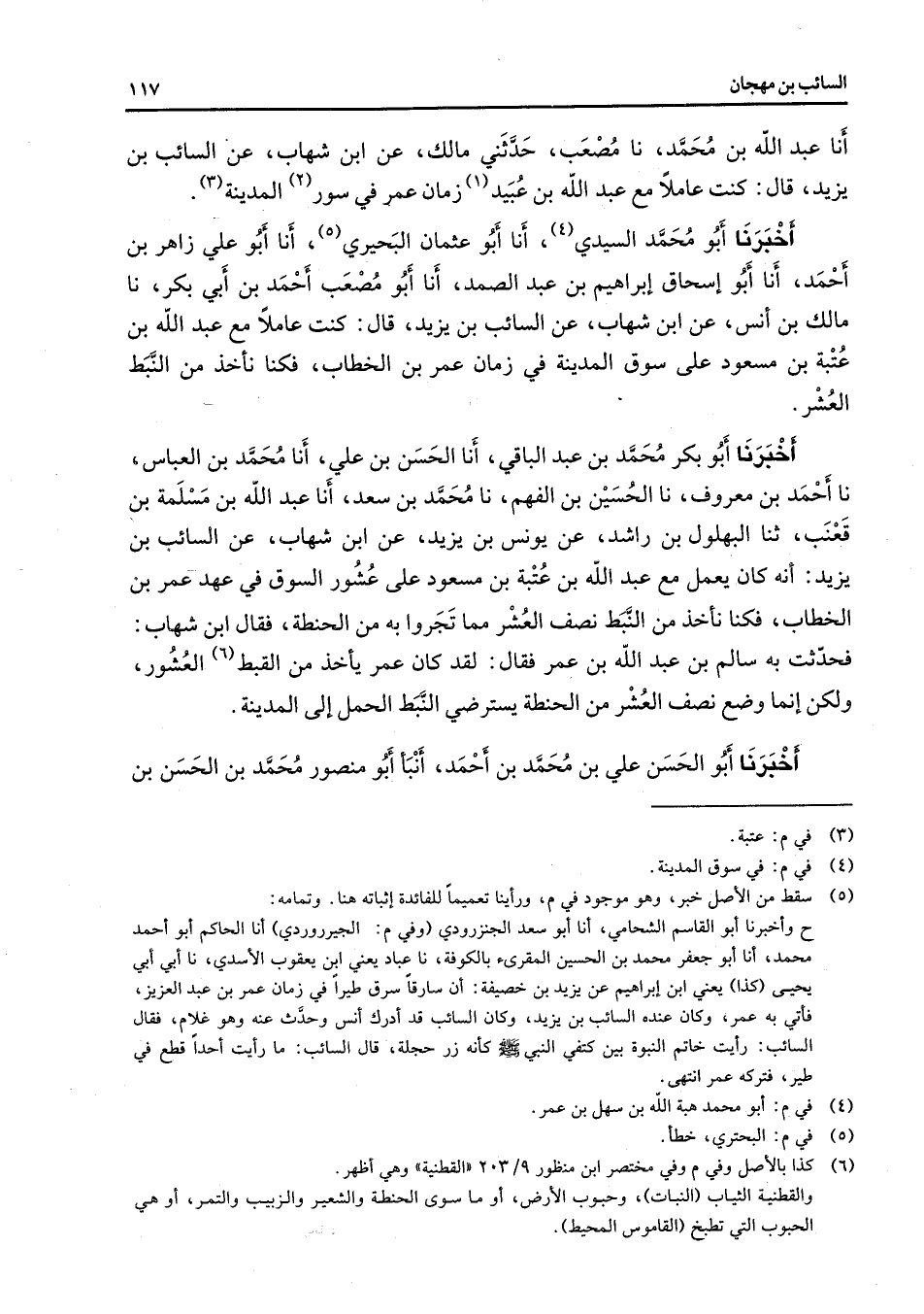 أنا عبد الله بن محمد نا مصعب حدثني مالك عن ابن شهاب عن السائب بن يزيد قال كنت عاملا مع عبد الله بن عبيد زمان عمر في سور (2) المدينة (3) أخبرنا أبو محمد السيدي (4) أنا أبو عثمان البحيري (5) أنا أبو علي زاهر بن أحمد أنا أبو إسحاق إبراهيم بن عبد الصمد أنا أبو مصعب أحمد بن أبي بكر نا مالك بن أنس عن ابن شهاب عن السائب بن يزيد قال كنت عاملا مع عبد الله بن عتبة بن مسعود على سوق المدينة في زمان عمر بن الخطاب فكنا نأخذ من النبط العشر أخبرنا أبو بكر محمد بن عبد الباقي أنا الحسن بن علي أنا محمد بن العباس نا أحمد بن معروف نا الحسين بن الفهم نا محمد بن سعد أنا عبد الله بن مسلمة بن قعنب ثنا البهلول بن راشد عن يونس بن يزيد عن ابن شهاب عن السائب بن يزيد أنه كان يعمل مع عبد الله بن عتبة بن مسعود على عشور السوق في عهد عمر بن الخطاب فكنا نأخذ من النبط نصف العشر مما تجروا به من الحنطة فقال ابن شهاب فحدثت به سالم بن عبد الله بن عمر فقال لقد كان عمر يأخذ من القبط (6) العشور ولكن إنما وضع نصف العشر من الحنطة يسترضي النبط الحمل إلى المدينة أخبرنا أبو الحسن علي بن محمد بن أحمد أنبأ أبو منصور محمد بن الحسن بن