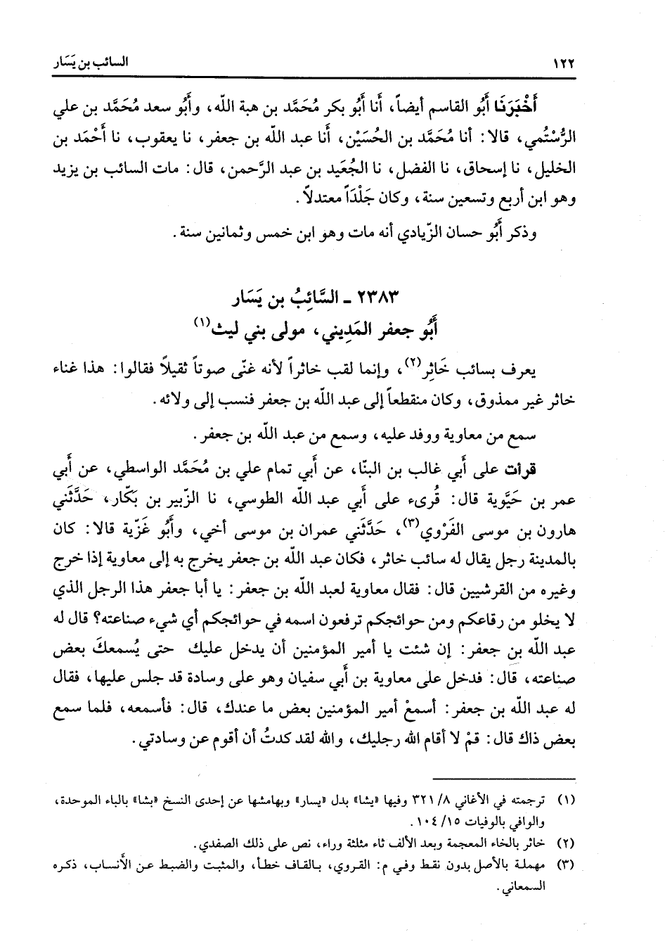 2383 - السائب بن يسار أبو جعفر المديني مولى بني ليث (1) يعرف بسائب خاثر (2) وإنما لقب خاثرا لأنه غنى صوتا ثقيلا فقالوا هذا غناء خاثر غير ممذوق وكان منقطعا إلى عبد الله بن جعفر فنسب إلى ولائه سمع من معاوية ووفد عليه وسمع من عبد الله بن جعفر قرأت على أبي غالب بن البنا عن أبي تمام علي بن محمد الواسطي عن أبي عمر بن حيوية قال قرئ على أبي عبد الله الطوسي نا الزبير بن بكار حدثني هارون بن موسى الفروي (3) حدثني عمران بن موسى أخي وأبو غزية قالا كان بالمدينة رجل يقال له سائب خاثر فكان عبد الله بن جعفر يخرج به إلى معاوية إذا خرج وغيره من القرشيين قال فقال معاوية لعبد الله بن جعفر يا أبا جعفر هذا الرجل الذي لا يخلو من رقاعكم ومن حوائجكم ترفعون اسمه في حوائجكم أي شئ صناعته قال له عبد الله بن جعفر إن شئت يا أمير المؤمنين أن يدخل عليك حتى يسمعك بعض صناعته قال فدخل على معاوية بن أبي سفيان وهو على وسادة قد جلس عليها فقال له عبد الله بن جعفر أسمع أمير المؤمنين بعض ما عندك قال فأسمعه فلما سمع بعض ذاك قال قم لا أقام الله رجليك والله لقد كدت أن أقوم عن وسادتي