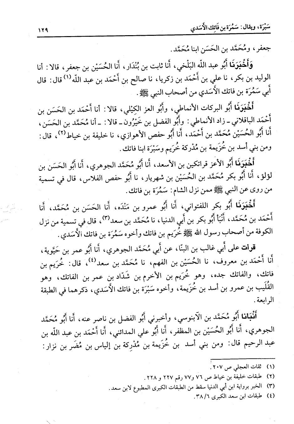 جعفر ومحمد بن الحسن ابنا محمد وأخبرنا أبو عبد الله البلخي أنا ثابت بن بندار أنا الحسين بن جعفر قالا أنا الوليد بن بكر نا علي بن أحمد بن زكريا نا صالح بن أحمد بن عبد الله (1) قال قال أبي سمرة بن فاتك الأسدي من أصحاب النبي (صلى الله عليه وسلم) أخبرنا أبو البركات الأنماطي وأبو العز الكيلي قالا أنا أحمد بن الحسن بن أحمد الباقلاني زاد الأنماطي وأبو الفضل بن خيرون قالا أنا محمد بن الحسن أنا أبو الحسين محمد بن أحمد أنا أبو حفص الأهوازي نا خليفة بن خياط (2) قال ومن بني أسد بن خزيمة بن مدركة خريم وسبرة ابنا فاتك أخبرنا أبو الأعز قراتكين بن الأسعد أنا أبو محمد الجوهري أنا أبو الحسن بن لؤلؤ أنا أبو بكر محمد بن الحسين بن شهريار نا أبو حفص الفلاس قال في تسمية من روى عن النبي (صلى الله عليه وسلم) ممن نزل الشام سمرة بن فاتك أخبرنا أبو بكر اللفتواني أنا أبو عمرو بن منده أنا الحسن بن محمد أنا أحمد بن محمد أنبأ أبو بكر بن أبي الدنيا نا محمد بن سعد (3) قال في تسمية من نزل الكوفة من أصحاب رسول الله (صلى الله عليه وسلم) خريم بن فاتك وأخوه سمرة بن فاتك الأسدي قرأت على أبي غالب بن البنا عن أبي محمد الجوهري أنا أبو عمر بن حيوية أنا أحمد بن معروف نا الحسين بن الفهم نا محمد بن سعد (4) قال خريم بن فاتك والفاتك جده وهو خريم بن الأخرم بن شداد بن عمر بن الفاتك وهو القليب بن عمرو بن أسد بن خزيمة وأخوه سبرة بن فاتك الأسدي ذكرهما في الطبقة الرابعة أنبأنا أبو محمد بن الآبنوسي وأخبرني أبو الفضل بن ناصر عنه أنا أبو محمد الجوهري أنا أبو الحسين بن المظفر أنا أبو علي المدائني أنا أحمد بن عبد الله بن عبد الرحيم قال ومن بني أسد بن خزيمة بن مدركة بن إلياس بن مضر بن نزار