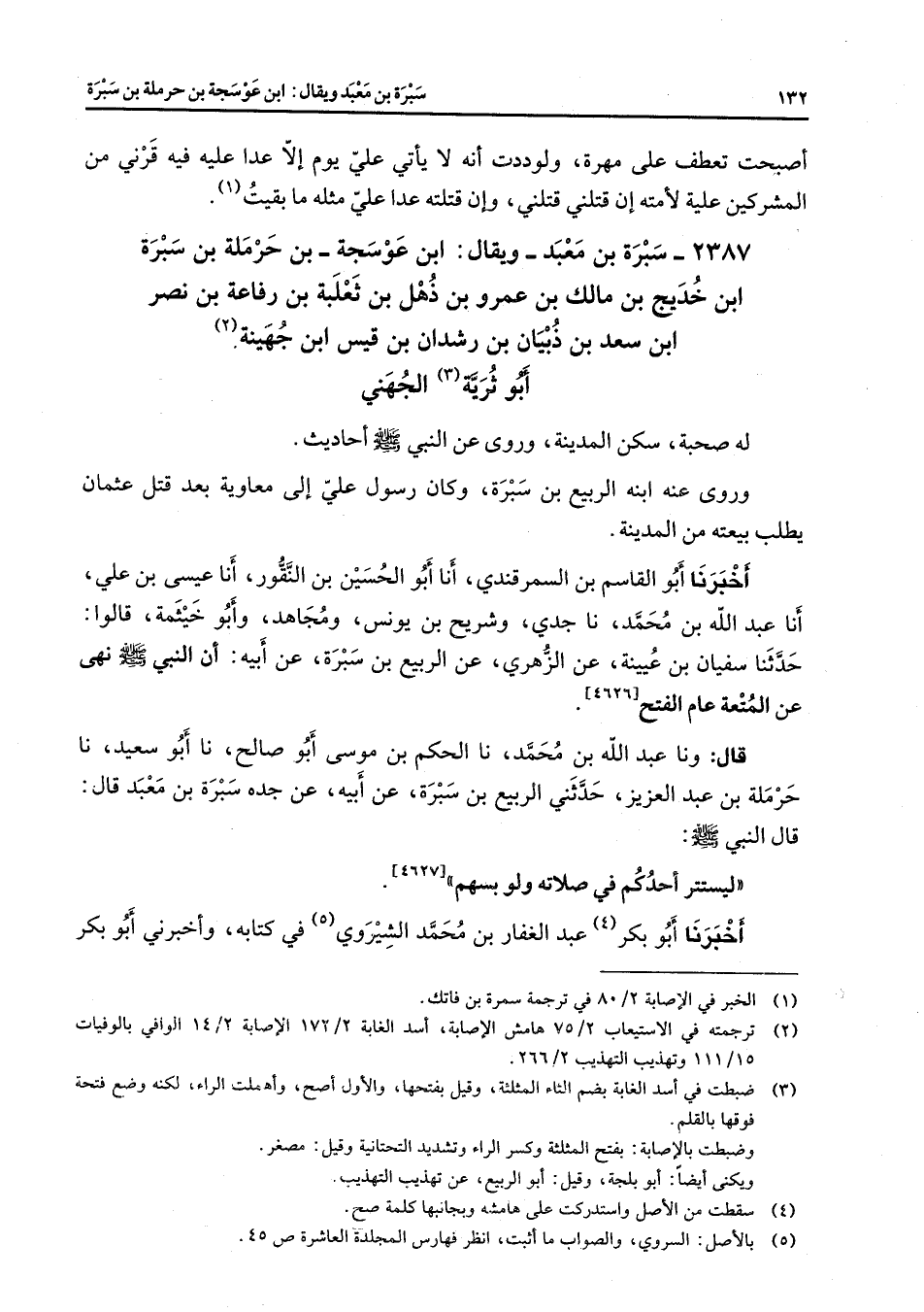 2387 - سبرة بن معبد ويقال ابن عوسجة بن حرملة بن سبرة ابن خديج بن مالك بن عمرو بن ذهل بن ثعلبة بن رفاعة بن نصر ابن سعد بن ذبيان بن رشدان بن قيس ابن جهينة (2) أبو ثرية (3) الجهني له صحبة سكن المدينة وروى عن النبي (صلى الله عليه وسلم) أحاديث وروى عنه ابنه الربيع بن سبرة وكان رسول علي إلى معاوية بعد قتل عثمان يطلب بيعته من المدينة أخبرنا أبو القاسم بن السمرقندي أنا أبو الحسين بن النقور أنا عيسى بن علي أنا عبد الله بن محمد نا جدي وشريح بن يونس ومجاهد وأبو خيثمة قالوا حدثنا سفيان بن عيينة عن الزهري عن الربيع بن سبرة عن أبيه أن النبي (صلى الله عليه وسلم) نهى عن المتعة عام الفتحح (4626) قال ونا عبد الله بن محمد نا الحكم بن موسى أبو صالح نا أبو سعيد نا حرملة بن عبد العزيز حدثني الربيع بن سبرة عن أبيه عن جده سبرة بن معبد قال قال النبي (صلى الله عليه وسلم) ليستتر أحدكم في صلاته ولو بسهم (4627) أخبرنا أبو بكر (4) عبد الغفار بن محمد الشيروي (5) في كتابه وأخبرني أبو بكر