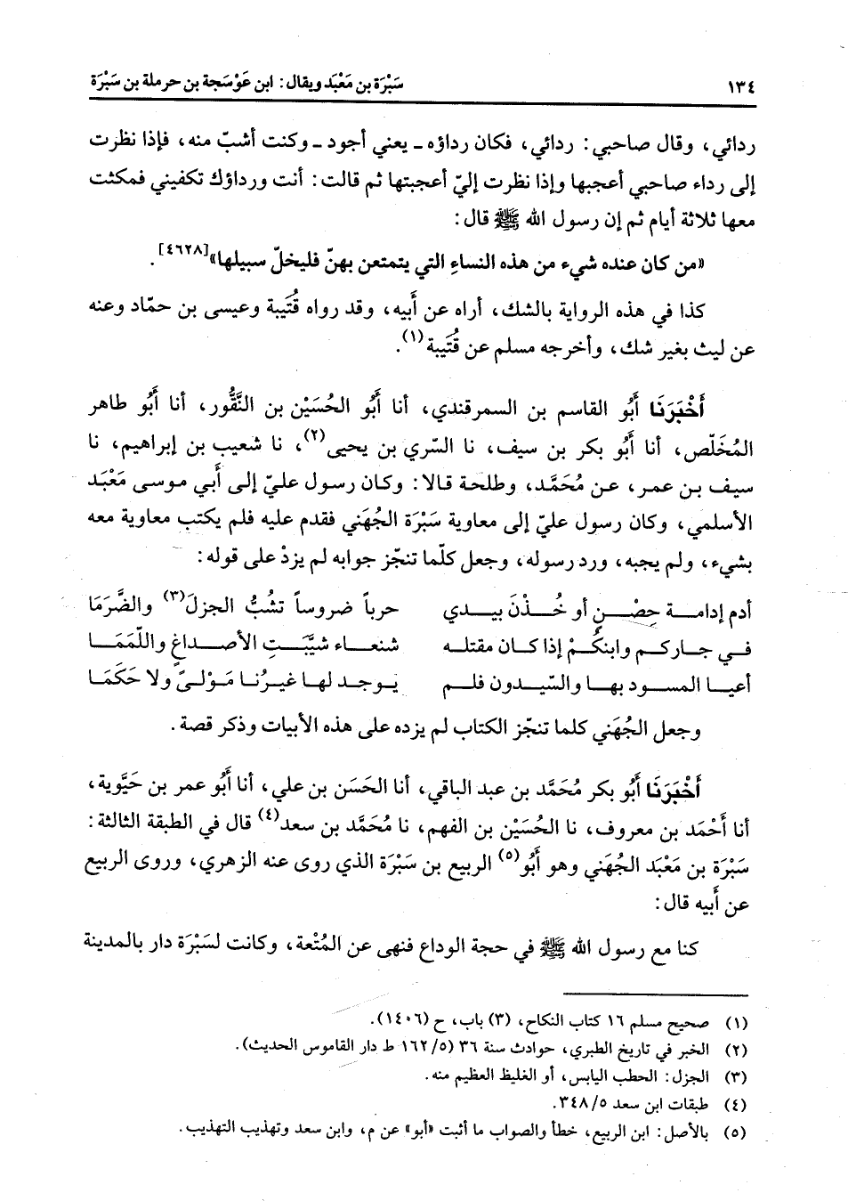 ردائي وقال صاحبي ردائي فكان رداؤه يعني أجود وكنت أشب منه فإذا نظرت إلى رداء صاحبي أعجبها وإذا نظرت إلي أعجبتها ثم قالت أنت ورداؤك تكفيني فمكثت معها ثلاثة أيام ثم إن رسول الله (صلى الله عليه وسلم) قال من كان عنده شئ من هذه النساء التي يتمتعن بهن فليخل سبيلها (4628) كذا في هذه الرواية بالشك أراه عن أبيه وقد رواه قتيبة وعيسى بن حماد وعنه عن ليث بغير شك وأخرجه مسلم عن قتيبة (1) أخبرنا أبو القاسم بن السمرقندي أنا أبو الحسين بن النقور أنا أبو طاهر المخلص أنا أبو بكر بن سيف نا السري بن يحيى (2) نا شعيب بن إبراهيم نا سيف بن عمر عن محمد وطلحة قالا وكان رسول علي إلى أبي موسى معبد الأسلمي وكان رسول علي إلى معاوية سبرة الجهني فقدم عليه فلم يكتب معاوية معه بشئ ولم يجبه ورد رسوله وجعل كلما تنجز جوابه لم يزد على قوله * أدم إدامة حصن أو خذن بيدي * حربا ضروسا تشب الجزل (3) والضر ما في جاركم وابنكم إذا كان مقتله * شنعاء شيبت الأصداغ واللمما أعيا المسود بها والسيدون فلم * يوجد لها غيرنا مولى ولا حكما * وجعل الجهني كلما تنجز الكتاب لم يزده على هذه الأبيات وذكر قصة أخبرنا أبو بكر محمد بن عبد الباقي أنا الحسن بن علي أنا أبو عمر بن حيوية أنا أحمد بن معروف نا الحسين بن الفهم نا محمد بن سعد (4) قال في الطبقة الثالثة سبرة بن معبد الجهني وهو أبو الربيع بن سبرة الذي روى عنه الزهري وروى الربيع عن أبيه قال كنا مع رسول الله (صلى الله عليه وسلم) في حجة الوداع فنهى عن المتعة وكانت لسبرة دار بالمدينة