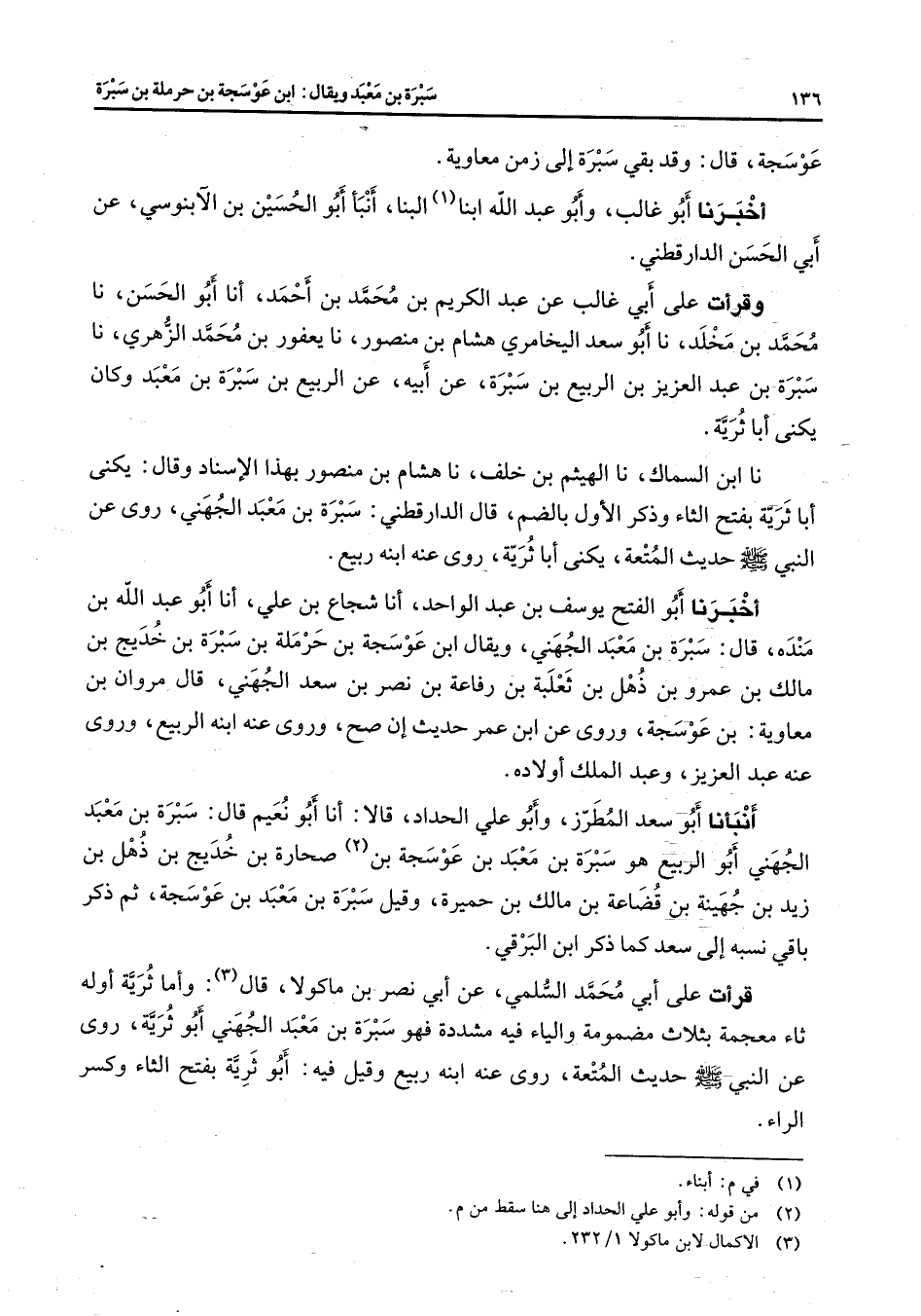 عوسجة قال وقد بقي سبرة إلى زمن معاوية أخبرنا أبو غالب وأبو عبد الله ابنا البنا أنبأ أبو الحسين بن الآبنوسي عن أبي الحسن الدارقطني وقرأت على أبي غالب عن عبد الكريم بن محمد بن أحمد أنا أبو الحسن نا محمد بن مخلد نا أبو سعد اليخامري هشام بن منصور نا يعفور بن محمد الزهري نا سبرة بن عبد العزيز بن الربيع بن سبرة عن أبيه عن الربيع بن سبرة بن معبد وكان يكنى أبا ثرية نا ابن السماك نا الهيثم بن خلف نا هشام بن منصور بهذا الإسناد وقال يكنى أبا ثرية بفتح الثاء وذكر الأول بالضم قال الدارقطني سبرة بن معبد الجهني روى عن النبي (صلى الله عليه وسلم) حديث المتعة يكنى أبا ثرية روى عنه ابنه ربيع أخبرنا أبو الفتح يوسف بن عبد الواحد أنا شجاع بن علي أنا أبو عبد الله بن منده قال سبرة بن معبد الجهني ويقال ابن عوسجة بن حرملة بن سبرة بن خديج بن مالك بن عمرو بن ذهل بن ثعلبة بن رفاعة بن نصر بن سعد الجهني قال مروان بن معاوية بن عوسجة وروى عن ابن عمر حديث إن صح وروى عنه ابنه الربيع وروى عنه عبد العزيز وعبد الملك أولاده أنبأنا أبو سعد المطرز وأبو علي الحداد قالا أنا أبو نعيم قال سبرة بن معبد الجهني أبو الربيع هو سبرة بن معبد بن عوسجة بن (2) صحارة بن خديج بن ذهل بن زيد بن جهينة بن قضاعة بن مالك بن حميرة وقيل سبرة بن معبد بن عوسجة ثم ذكر باقي نسبه إلى سعد كما ذكر ابن البرقي قرأت على أبي محمد السلمي عن أبي نصر بن ماكولا قال (3) وأما ثرية أوله ثاء معجمة بثلاث مضمومة والياء فيه مشددة فهو سبرة بن معبد الجهني أبو ثرية روى عن النبي (صلى الله عليه وسلم) حديث المتعة روى عنه ابنه ربيع وقيل فيه أبو ثرية بفتح الثاء وكسر الراء