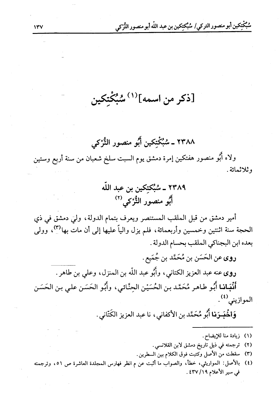 2389 - سبكتكين بن عبد الله أبو منصور التركي (2) أمير دمشق من قبل الملقب المستنصر ويعرف بتمام الدولة ولي دمشق في ذي الحجة سنة اثنتين وخمسين وأربعمائة فلم يزل واليا عليها إلى أن مات بها (3) وولى بعده ابن البجناكي الملقب بحسام الدولة روى عن الحسن بن محمد بن جميع روى عنه عبد العزيز الكتاني وأبو عبد الله بن المنزل وعلي بن طاهر أنبأنا أبو طاهر محمد بن الحسين الحنائي وأبو الحسن علي بن الحسن الموازيني (4) وأخبرنا أبو محمد بن الأكفاني نا عبد العزيز الكتاني