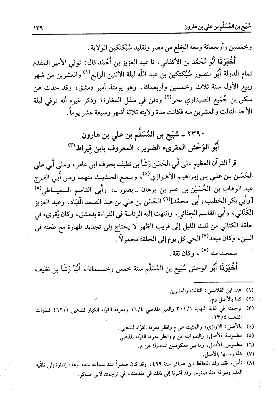 2390 - سبيع بن المسلم بن علي بن هارون أبو الوحش المقرئ الضرير المعروف بابن قيراط (3) قرأ القرآن العظيم على أبي الحسن رشأ بن نظيف بحرف ابن عامر وعلى أبي علي الحسن بن علي بن إبراهيم الأهوازي (4) وسمع الحديث منهما ومن أبي الفرج عبد الوهاب بن الحسين بن عمر بن برهان بصور وأبي القاسم السميساطي (5) وأبي بكر الخطيب وأبي محمد (6) الحسن بن علي بن عبد الصمد اللباد وعبد العزيز الكتاني وأبي القاسم الحنائي وانتهت إليه الرئاسة في القراءة بدمشق وكان يقرئ في حلقة الكتاني من ثلث الليل إلى قريب الظهر لا يحتاج إلى تجديد طهارة مع طعنه في السن وكان مبعد (7) الحي كل يوم إلى الحلقة محمولا سمعت (7) منه وكان ثقة أخبرنا أبو الوحش سبيع بن المسلم سنة خمس وخمسمائة أنبأ رشأ بن نظيف
