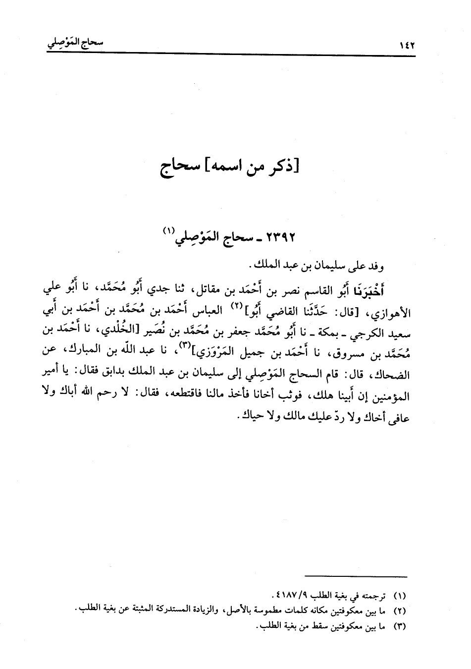 2392 - سحاج الموصلي (1) وفد على سليمان بن عبد الملك أخبرنا أبو القاسم نصر بن أحمد بن مقاتل ثنا جدي أبو محمد نا أبو علي الأهوازي قال حدثنا القاضي أبو (2) العباس أحمد بن محمد بن أحمد بن أبي سعيد الكرجي بمكة نا أبو محمد جعفر بن محمد بن نصير الخلدي نا أحمد بن محمد بن مسروق نا أحمد بن جميل المروزي (3) نا عبد الله بن المبارك عن الضحاك قال قام السحاج الموصلي إلى سليمان بن عبد الملك بدابق فقال يا أمير المؤمنين إن أبينا هلك فوثب أخانا فأخذ مالنا فاقتطعه فقال لا رحم الله أباك ولا عافى أخاك ولا رد عليك مالك ولا حياك