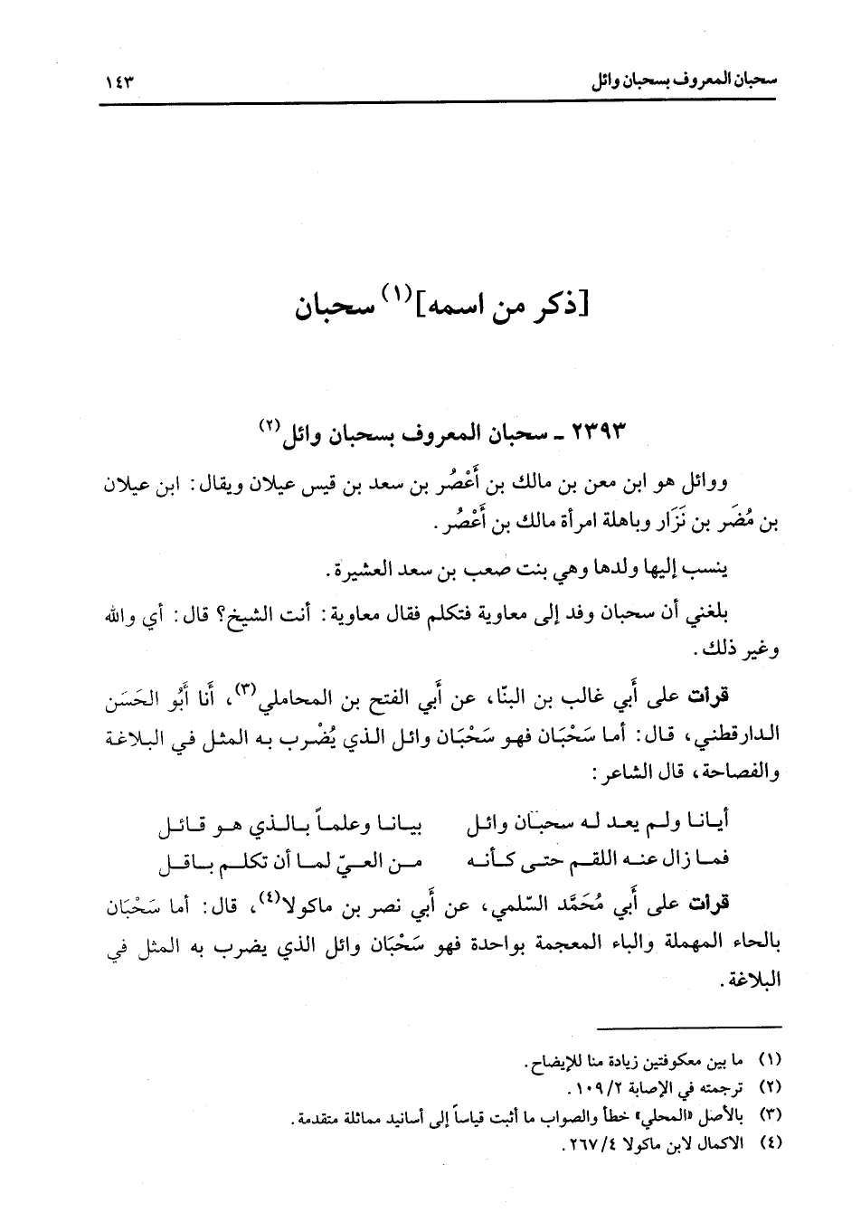 2393 - سحبان المعروف بسحبان وائل (2) ووائل هو ابن معن بن مالك بن أعصر بن سعد بن قيس عيلان ويقال ابن عيلان بن مضر بن نزار وباهلة امرأة مالك بن أعصر ينسب إليها ولدها وهي بنت صعب بن سعد العشيرة بلغني أن سحبان وفد إلى معاوية فتكلم فقال معاوية أنت الشيخ قال أي والله وغير ذلك قرأت على أبي غالب البنا عن أبي الفتح بن المحاملي (3) أنا أبو الحسن الدارقطني قال أما سحبان فهو سحبان وائل الذي يضرب به المثل في البلاغة والفصاحة قال الشاعر * أيانا ولم يعد له سحبان وائل * بيانا وعلما بالذي هو قائل فما زال عنه اللقم حتى كأنه * من العي لما أن تكلم باقل * قرأت على أبي محمد السلمي عن أبي نصر بن ماكولا (4) قال أما سحبان بالحاء المهملة والباء المعجمة بواحدة فهو سحبان وائل الذي يضرب به المثل في البلاغة