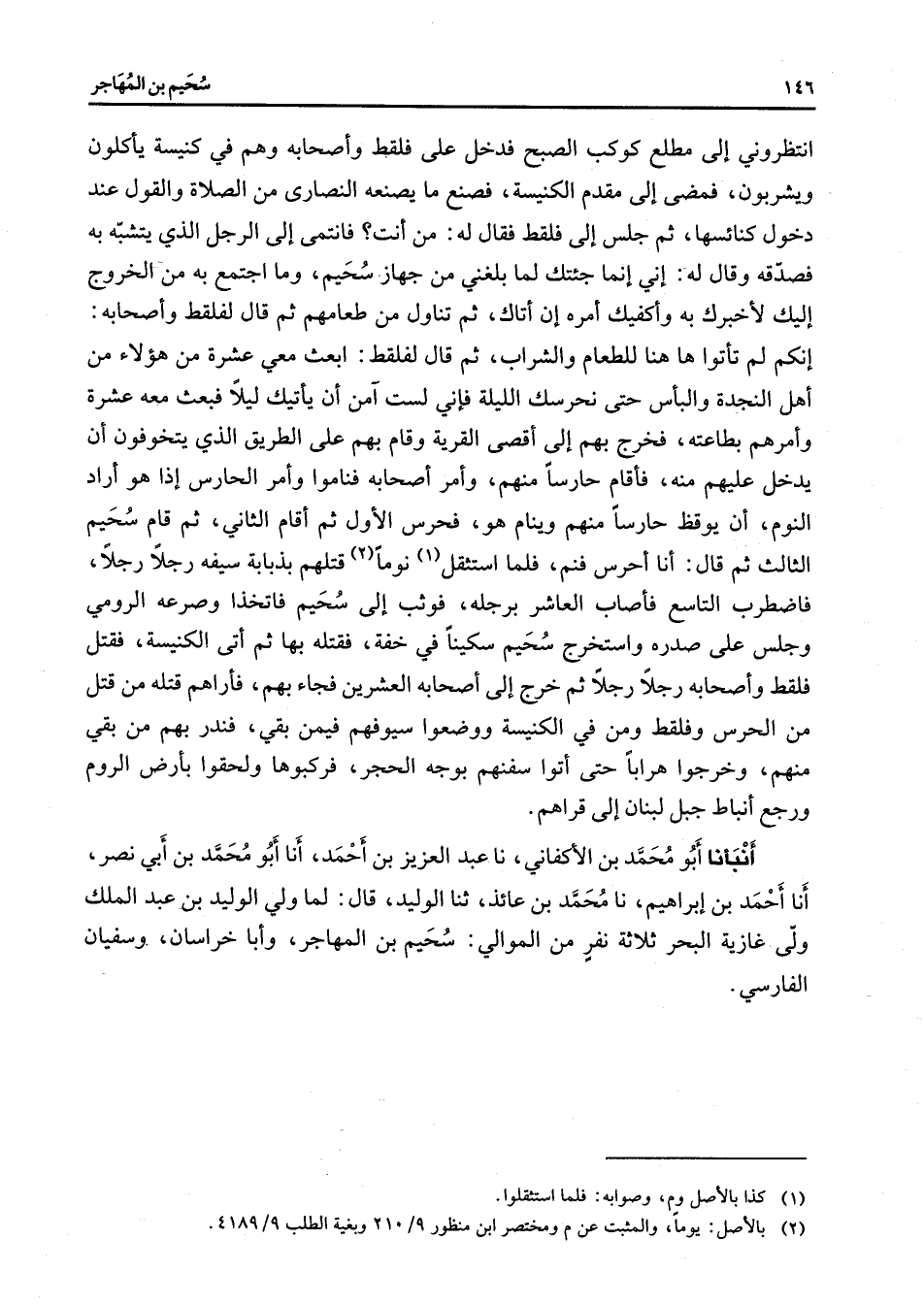 انتظروني إلى مطلع كوكب الصبح فدخل على فلقط وأصحابه وهم في كنيسة يأكلون ويشربون فمضى إلى مقدم الكنيسة فصنع ما يصنعه النصارى من الصلاة والقول عند دخول كنائسها ثم جلس إلى فلقط فقال له من أنت فانتمى إلى الرجل الذي يتشبه به فصدقه وقال له إني إنما جئتك لما بلغني من جهاز سحيم وما اجتمع به من الخروج إليك لأخبرك به وأكفيك أمره إن أتاك ثم تناول من طعامهم ثم قال لفلقط وأصحابه إنكم لم تأتوا ها هنا للطعام والشراب ثم قال لفلقط ابعث معي عشرة من هؤلاء من أهل النجدة والبأس حتى نحرسك الليلة فإني لست آمن أن يأتيك ليلا فبعث معه عشرة وأمرهم بطاعته فخرج بهم إلى أقصى القرية وقام بهم على الطريق الذي يتخوفون أن يدخل عليهم منه فأقام حارسا منهم وأمر أصحابه فناموا وأمر الحارس إذا هو أراد النوم أن يوقظ حارسا منهم وينام هو فحرس الأول ثم أقام الثاني ثم قام سحيم الثالث ثم قال أنا أحرس فنم فلما استثقل (1) نوما (2) قتلهم بذبابة سيفه رجلا رجلا فاضطرب التاسع فأصاب العاشر برجله فوثب إلى سحيم فاتخذا وصرعه الرومي وجلس على صدره واستخرج سحيم سكينا في خفة فقتله بها ثم أتى الكنيسة فقتل فلقط وأصحابه رجلا رجلا ثم خرج إلى أصحابه العشرين فجاء بهم فأراهم قتله من قتل من الحرس وفلقط ومن في الكنيسة ووضعوا سيوفهم فيمن بقي فندر بهم من بقي منهم وخرجوا هرابا حتى أتوا سفنهم بوجه الحجر فركبوها ولحقوا بأرض الروم ورجع أنباط جبل لبنان إلى قراهم أنبأنا أبو محمد بن الأكفاني نا عبد العزيز بن أحمد أنا أبو محمد بن أبي نصر أنا أحمد بن إبراهيم نا محمد بن عائذ ثنا الوليد قال لما ولي الوليد بن عبد الملك ولى غازية البحر ثلاثة نفر من الموالي سحيم بن المهاجر وأبا خراسان وسفيان الفارسي