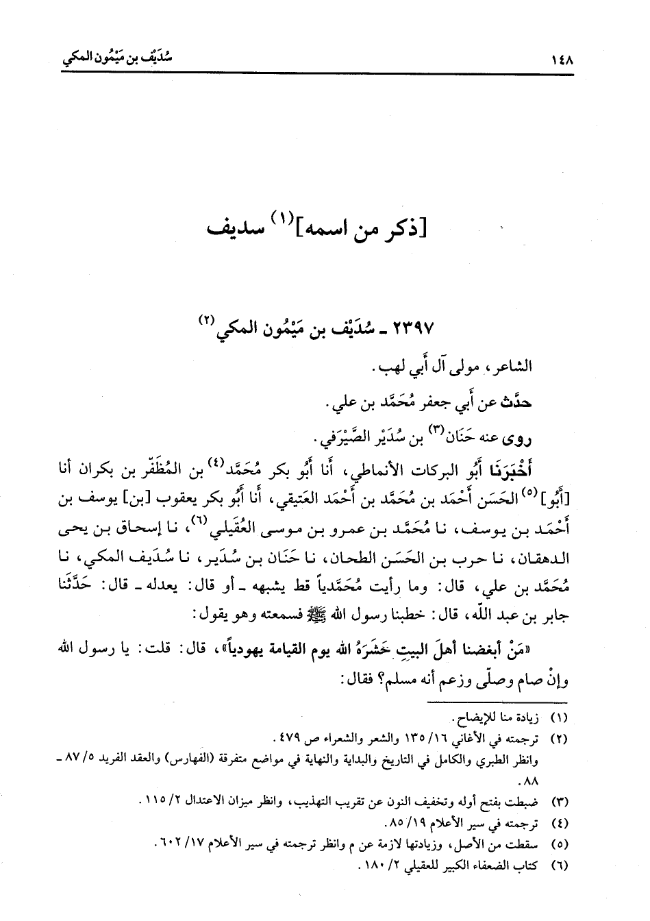 2397 - سديف بن ميمون المكي (2) الشاعر مولى آل أبي لهب حدث عن أبي جعفر محمد بن علي روى عنه حنان (3) بن سدير الصيرفي أخبرنا أبو البركات الأنماطي أنا أبو بكر محمد (4) بن المظفر بن بكران أنا أبو (5) الحسن أحمد بن محمد بن أحمد العتيقي أنا أبو بكر يعقوب بن يوسف بن أحمد بن يوسف نا محمد بن عمرو بن موسى العقيلي (6) نا إسحاق بن يحيى الدهقان نا حرب بن الحسن الطحان نا حنان بن سدير نا سديف المكي نا محمد بن علي قال وما رأيت محمديا قط يشبهه أو قال يعدله قال حدثنا جابر بن عبد الله قال خطبنا رسول الله (صلى الله عليه وسلم) فسمعته وهو يقول من أبغضنا أهل البيت حشره الله يوم القيامة يهوديا قال قلت يا رسول الله وإن صام وصلى وزعم أنه مسلم فقال